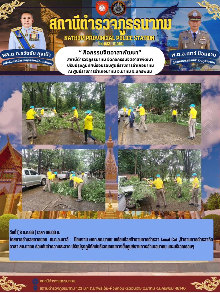 โดยการอำนวยการของ พ.ต.อ.เชาว์ ป้อมงาม ผกก.สภ.นาทม พร้อมด้วยข้าราชการตำรวจ Local Cat ,ข้าราชการตำรวจจิตอาสา สภ.นาทม ร่วมกันทำความสะอาด ปรับปรุงภูมิทัศน์บริเวณถนนทางขึ้นศูนย์ราชการอำเภอนาทม และบริเวณรอบๆ
