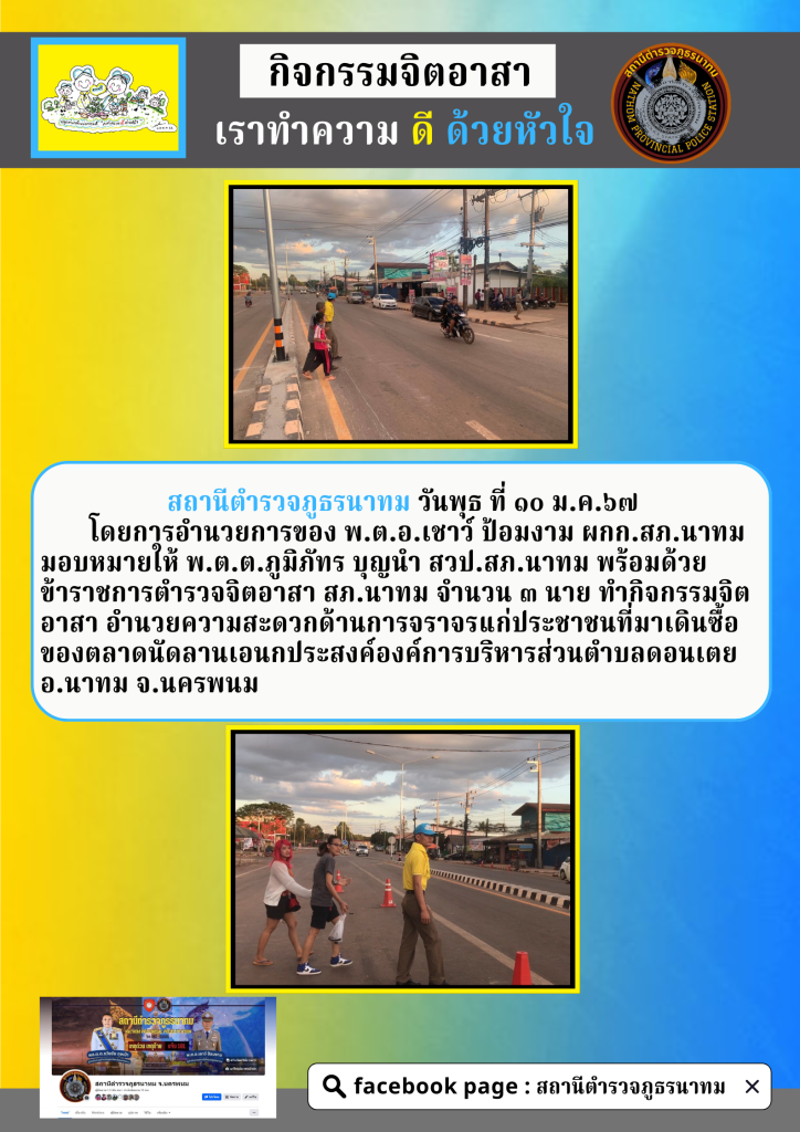 โดยการอำนวยการของ พ.ต.อ.เชาว์ ป้อมงาม ผกก.สภ.นาทม มอบหมายให้ พ.ต.ต.ภูมิภัทร บุญนำ สวป.สภ.นาทม พร้อมด้วยข้าราชการตำรวจจิตอาสา สภ.นาทม จำนวน 3 นาย ทำกิจกรรมจิตอาสา อำนวยความสะดวกด้านการจราจรแก่ประชาชนที่มาเดินซื้อของตลาดนัดลานเอนกประสงค์องค์การบริหารส่วนตำบลดอนเตย อ.นาทม จ.นครพนม