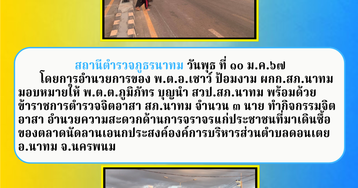 โดยการอำนวยการของ พ.ต.อ.เชาว์ ป้อมงาม ผกก.สภ.นาทม มอบหมายให้ พ.ต.ต.ภูมิภัทร บุญนำ สวป.สภ.นาทม พร้อมด้วยข้าราชการตำรวจจิตอาสา สภ.นาทม จำนวน 3 นาย ทำกิจกรรมจิตอาสา อำนวยความสะดวกด้านการจราจรแก่ประชาชนที่มาเดินซื้อของตลาดนัดลานเอนกประสงค์องค์การบริหารส่วนตำบลดอนเตย อ.นาทม จ.นครพนม