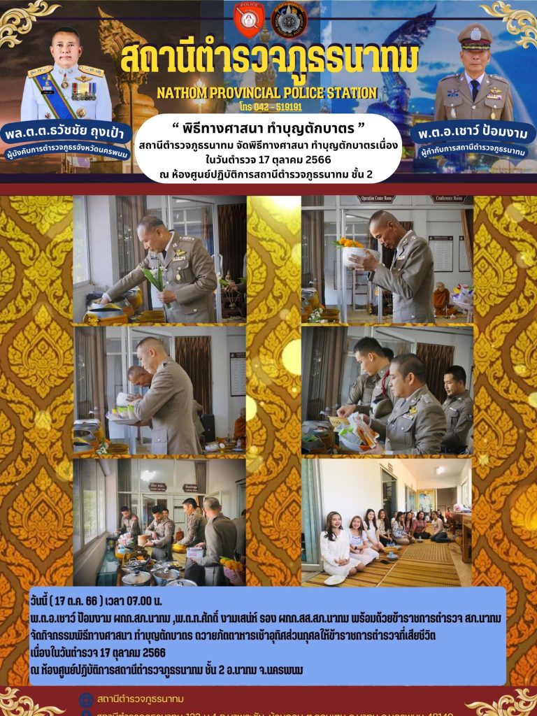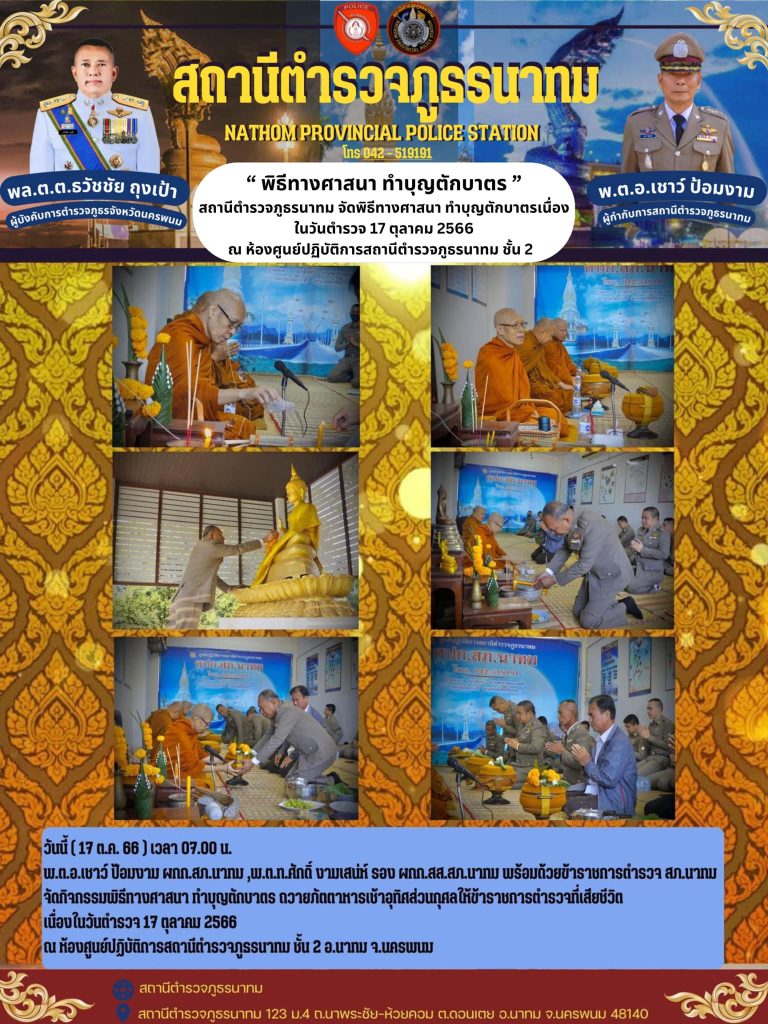 พ.ต.อ.เชาว์ ป้อมงาม ผกก.สภ.นาทม ,พ.ต.ท.ศักดิ์ งามเสน่ห์ รอง ผกก.สส.สภ.นาทม พร้อมด้วยข้าราชการตำรวจ สภ.นาทม จัดกิจกรรมพิธีทางศาสนา ทำบุญตักบาตร ถวายภัตตาหารเนื่องในวันตำรวจ 17 ตุลาคม 2566 ณ ห้องศูนย์ปฏิบัติการสถานีตำรวจภูธรนาทม ชั้น 2 อ.นาทม จ.นครพนม