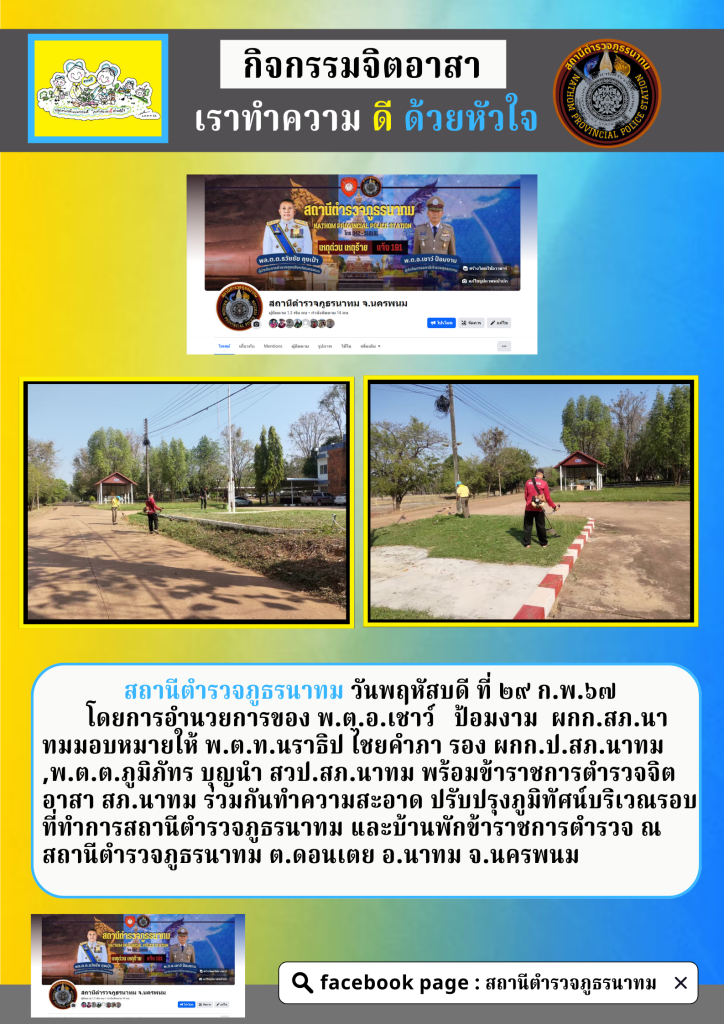 โดยการอำนวยการของ พ.ต.อ.เชาว์ ป้อมงาม ผกก.สภ.นาทม มอบหมายให้ พ.ต.ท.นราธิป ไชยคำภา รอง ผกก.ป.สภ.นาทม ,พ.ต.ต.ภูมิภัทร บุญนำ สวป.สภ.นาทม พร้อมข้าราชการตำรวจจิตอาสา สภ.นาทม ร่วมกันทำความสะอาด ปรับปรุงภูมิทัศน์บริเวณรอบที่ทำการสถานีตำรวจภูธรนาทม และบ้านพักข้าราชการตำรวจ