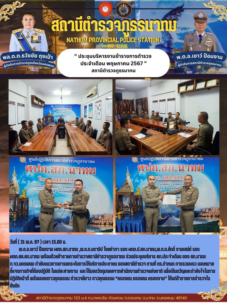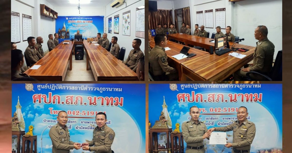 ร่วมประชุมบริหาร สภ.ประจำเดือน ของ สภ.นาทม ภ.จว.นครพนม กำชับแนวทางการยกระดับการให้บริการประชาชน ของสถานีตำรวจ ตามที่ ตร.กำหนด การรวมแถว มอบหมายชี้แจงภารกิจที่ต้องปฏิบัติ ในแต่ละสายงาน และได้มอบวัตถุมงคลจากสำนักงานตำรวจแห่งชาติ เพื่อเป็นขวัญและกำลังใจในการปฏิบัติหน้าที่ พร้อมมอบดาวคุณธรรม ตำรวจสีขาว ดาวคุณธรรม “ครองตน ครองคน ครองงาน” ให้แก่ข้าราชการตำรวจในสังกัด