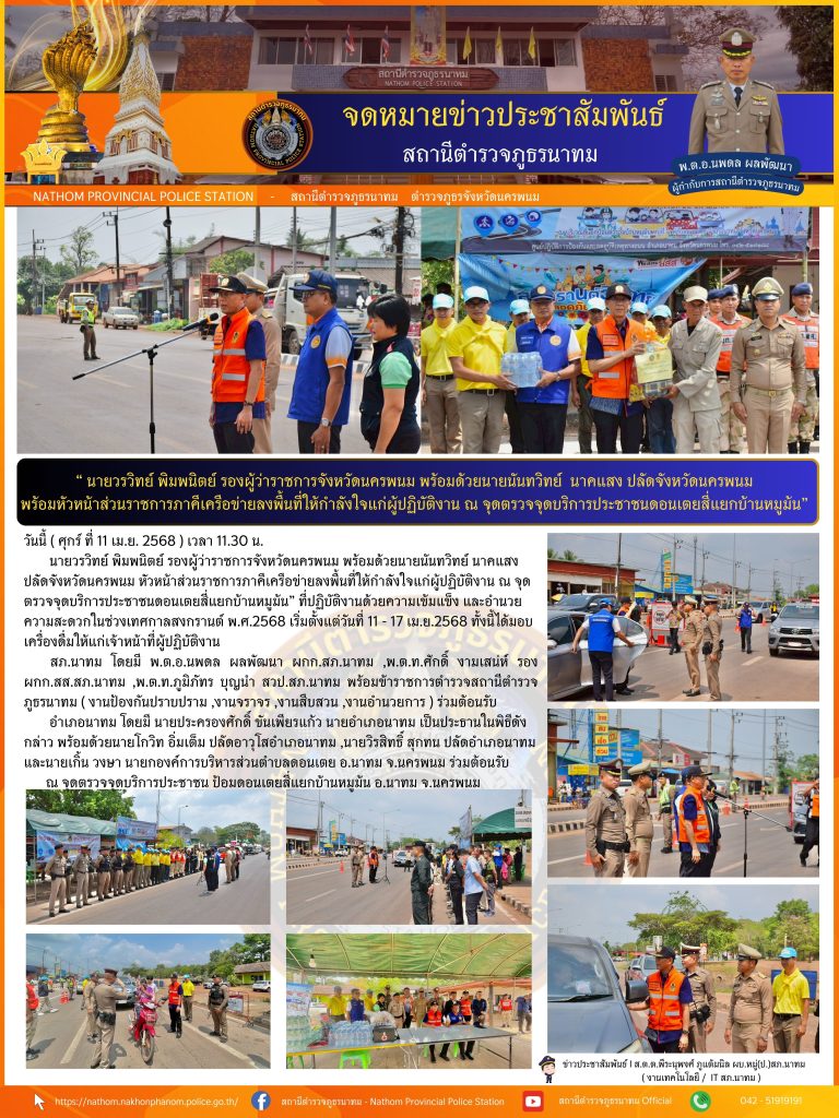 นายวรวิทย์ พิมพนิตย์ รองผู้ว่าราชการจังหวัดนครพนม พร้อมด้วยนายนันทวิทย์ นาคแสง ปลัดจังหวัดนครพนม หัวหน้าส่วนราชการภาคีเครือข่ายลงพื้นที่ให้กำลังใจแก่ผู้ปฏิบัติงาน ณ จุดตรวจจุดบริการประชาชนดอนเตยสี่แยกบ้านหมูม้น” ที่ปฏิบัติงานด้วยความเข้มแข็ง และอำนวยความสะดวกในช่วงเทศกาลสงกรานต์ พ.ศ.2568 เริ่มตั้งแต่วันที่ 11 – 17 เม.ย.2568 ทั้งนี้ได้มอบเครื่องดื่มให้แก่เจ้าหน้าที่ผู้ปฏิบัติงาน