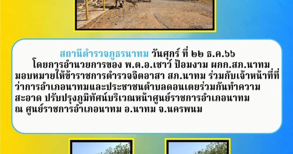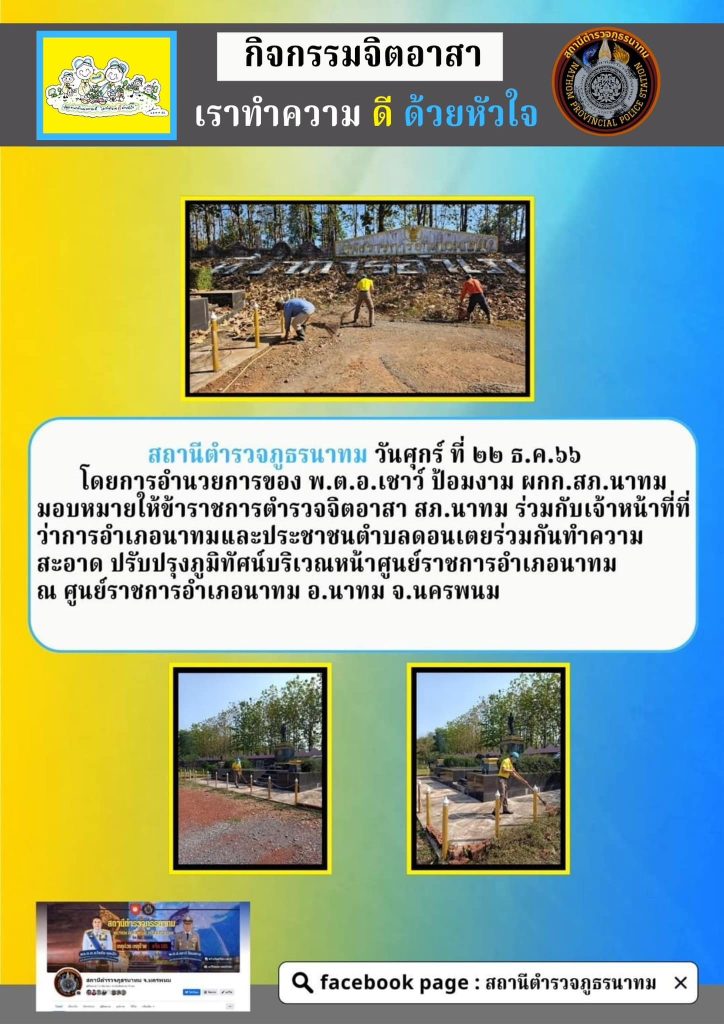 โดยการอำนวยการของ พ.ต.อ.เชาว์ ป้อมงาม ผกก.สภ.นาทม มอบหมายให้ข้าราชการตำรวจจิตอาสา สภ.นาทม ร่วมกับเจ้าหน้าที่ที่ว่าการอำเภอนาทมและประชาชนตำบลดอนเตยร่วมกันทำความสะอาด ปรับปรุงภูมิทัศน์บริเวณหน้าศูนย์ราชการอำเภอนาทม อ.นาทม จ.นครพนม