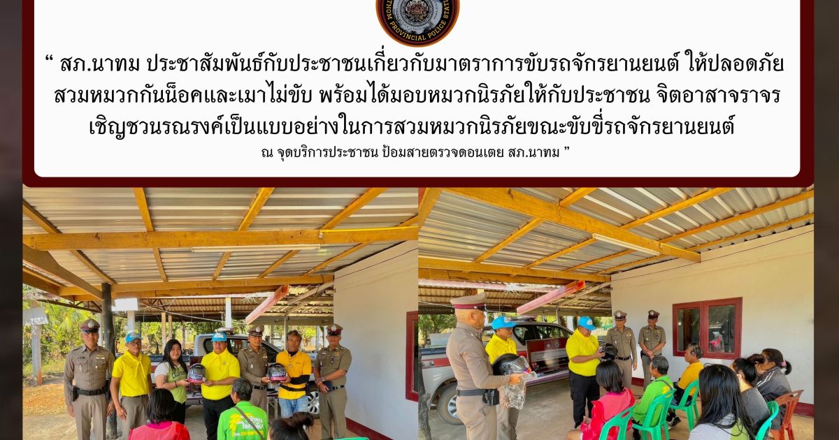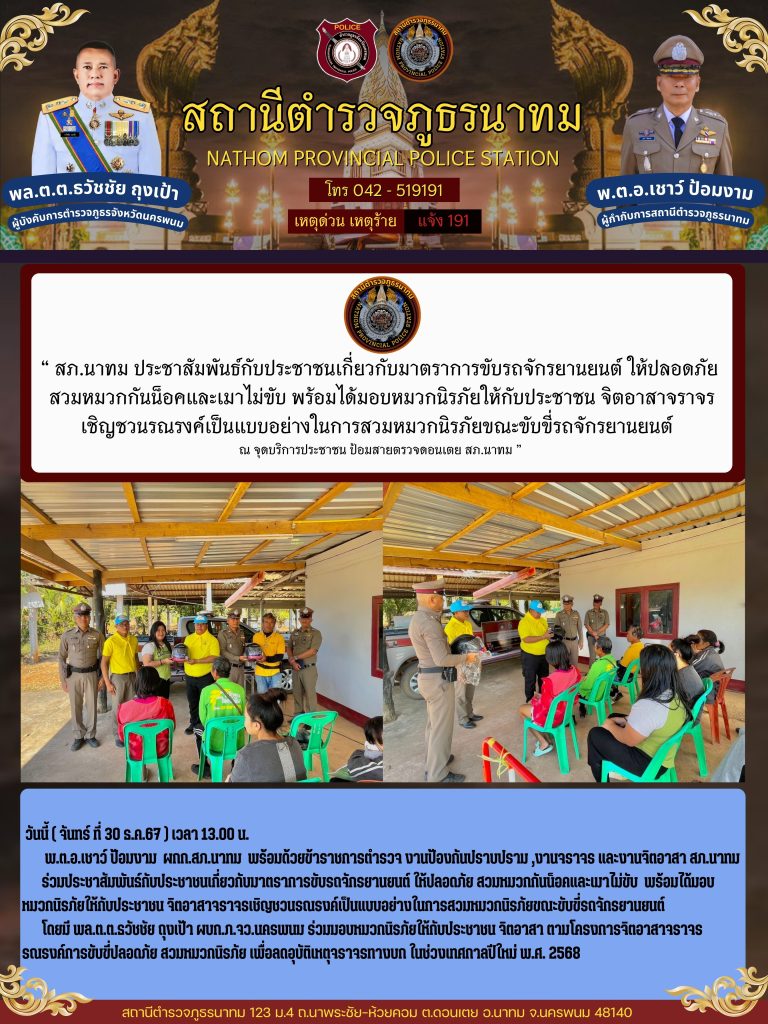 พล.ต.ต.ธวัชชัย ถุงเป้า ผบก.ภ.จว.นครพนม ,พ.ต.อ.เชาว์ ป้อมงาม ผกก.สภ.นาทม ประชาสัมพันธ์พร้อมได้มอบหมวกนิรภัยให้กับประชาชน จิตอาสาจราจรเชิญชวนรณรงค์เป็นแบบอย่างในการสวมหมวกนิรภัยขณะขับขี่รถจักรยานยนต์ เพื่อลดอุบัติเหตุจราจรทางบก ในช่วงเทศกาลปีใหม่ พ.ศ. 2568