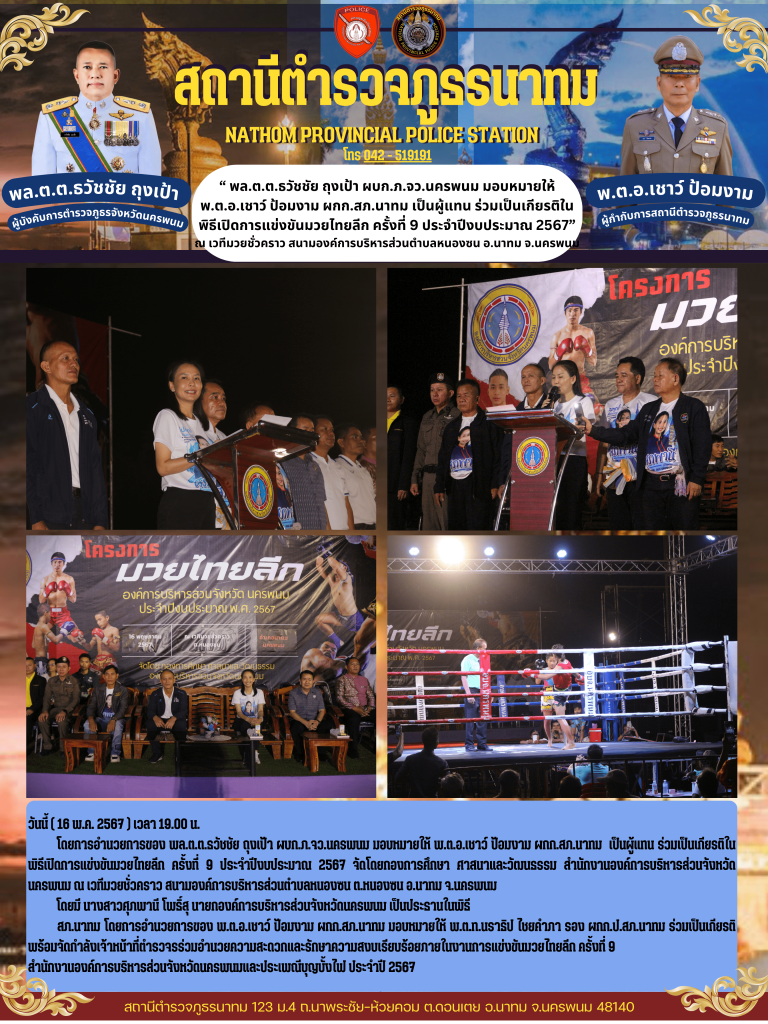 โดยการอำนวยการของ พล.ต.ต.ธวัชชัย ถุงเป้า ผบก.ภ.จว.นครพนม มอบหมายให้ พ.ต.อ.เชาว์ ป้อมงาม ผกก.สภ.นาทม เป็นผู้แทน ร่วมเป็นเกียรติในพิธีเปิดการแข่งขันมวยไทยลีก ครั้งที่ 9 ประจำปีงบประมาณ 2567 จัดโดยกองการศึกษา ศาสนาและวัฒนธรรม สำนักงานองค์การบริหารส่วนจังหวัดนครพนม ณ เวทีมวยชั่วคราว สนามองค์การบริหารส่วนตำบลหนองซน ต.หนองซน อ.นาทม จ.นครพนม