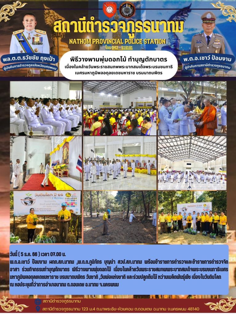 พ.ต.อ.เชาว์ ป้อมงาม ผกก.สภ.นาทม ,พ.ต.ต.ภูมิภัทร บุญนำ สวป.สภ.นาทม พร้อมข้าราชการตำรวจและข้าราชการตำรวจจิตอาสา ร่วมกิจกรรมทำบุญตักบาตร พิธีวางพานพุ่มดอกไม้ เนื่องในคล้ายวันพระราชสมภพพระบาทสมเด็จพระบรมชนกาธิเบศรมหาภูมิพลอดุลยเดชมหาราช บรมนาถบพิตร วันชาติ ,วันพ่อแห่งชาติ และร่วมปลูกต้นไม้ หว่านเมล็ดพันธุ์พืช เนื่องในวันดินโลก ณ หอประชุมที่ว่าการอำเภอนาทม ต.ดอนเตย อ.นาทม จ.นครพนม