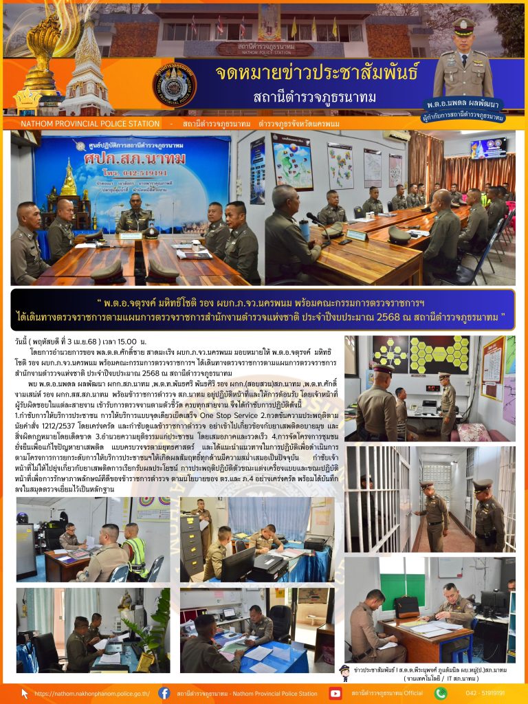 พ.ต.อ.จตุรงค์ มหิทธิโชติ รอง ผบก.ภ.จว.นครพนม พร้อมคณะกรรมการตรวจราชการฯ ได้เดินทางตรวจราชการตามแผนการตรวจราชการสำนักงานตำรวจแห่งชาติ ประจำปีงบประมาณ 2568 ณ สถานีตำรวจภูธรนาทม