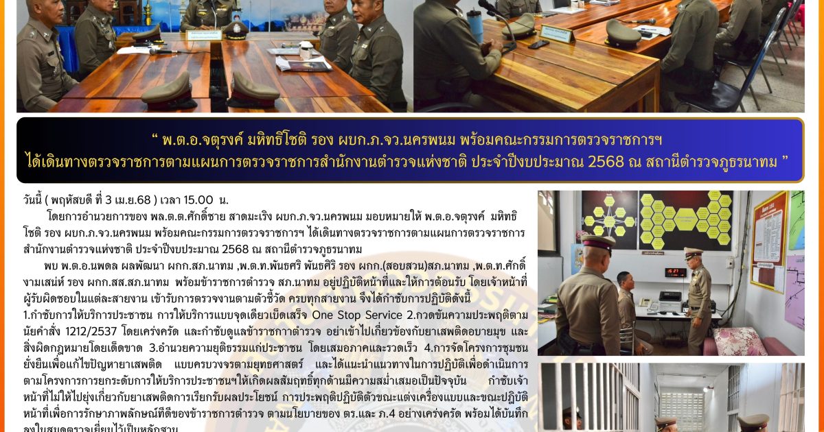 พ.ต.อ.จตุรงค์ มหิทธิโชติ รอง ผบก.ภ.จว.นครพนม พร้อมคณะกรรมการตรวจราชการฯ ได้เดินทางตรวจราชการตามแผนการตรวจราชการสำนักงานตำรวจแห่งชาติ ประจำปีงบประมาณ 2568 ณ สถานีตำรวจภูธรนาทม