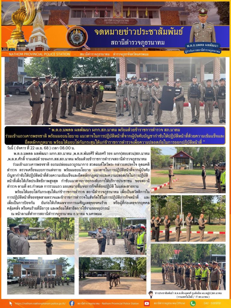 พ.ต.อ.นพดล ผลพัฒนา ผกก.สภ.นาทม พร้อมด้วยข้าราชการตำรวจสถานีตำรวจภูธรนาทม ร่วมเข้าแถวเคารพธงชาติ อบรมปล่อยแถวบูรณาการ ได้สั่งการกำชับ นโยบาย ต่อต้านการรับสินบน (Anti Bribery Policy) โดยให้ข้าราชการตำรวจในสังกัดทุกนายถือปฎิบัติตามคำสั่งอย่างเคร่งครัด พร้อมได้มอบโล่กันกระสุนให้แก่ข้าราชการตำรวจ สถานีตำรวจภูธรนาทม เพื่อเป็นสวัสดิการในการปฏิบัติหน้าที่ของชุดสายตรวจและข้าราชการตำรวจในสังกัดใช้ในการปฏิบัติภารกิจหน้าที่