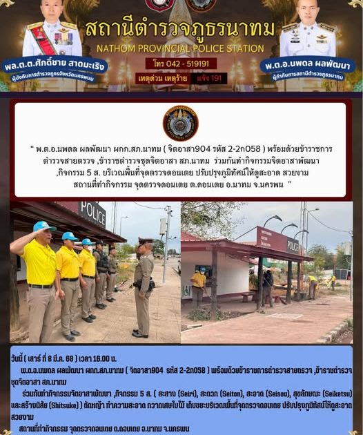 พ.ต.อ.นพดล ผลพัฒนา ผกก.สภ.นาทม ( จิตอาสา904 รหัส 2-2ก058 ) พร้อมด้วยข้าราชการตำรวจสายตรวจ ,ข้าราชตำรวจชุดจิตอาสา สภ.นาทม ร่วมกันทำกิจกรรมจิตอาสาพัฒนา ,กิจกรรม 5 ส. ( สะสาง (Seiri), สะดวก (Seiton), สะอาด (Seisou), สุขลักษณะ (Seiketsu) และสร้างนิสัย (Shitsuke) ) ตัดหญ้า ทำความสะอาด กวาดเศษใบไม้ เก็บขยะบริเวณพื้นที่จุดตรวจดอนเตย ปรับปรุงภูมิทัศน์ให้ดูสะอาด สวยงาม