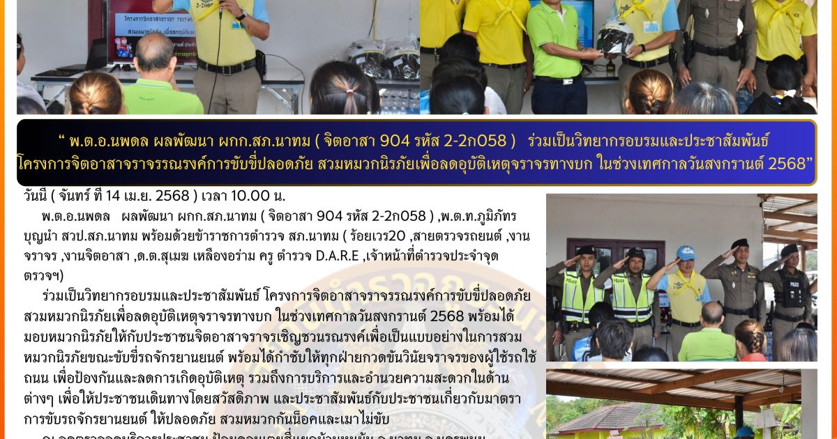พ.ต.อ.นพดล ผลพัฒนา ผกก.สภ.นาทม ( จิตอาสา 904 รหัส 2-2ก058 ) พร้อมด้วยข้าราชการตำรวจ สภ.นาทม ร่วมเป็นวิทยากรอบรมและประชาสัมพันธ์ โครงการจิตอาสาจราจรรณรงค์การขับขี่ปลอดภัย สวมหมวกนิรภัยเพื่อลดอุบัติเหตุจราจรทางบก ในช่วงเทศกาลวันสงกรานต์ 2568
