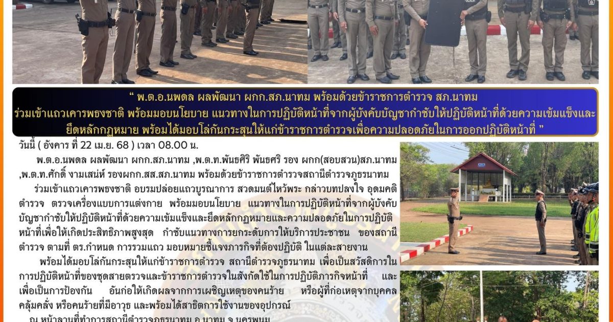 พ.ต.อ.นพดล ผลพัฒนา ผกก.สภ.นาทม พร้อมด้วยข้าราชการตำรวจสถานีตำรวจภูธรนาทม ร่วมเข้าแถวเคารพธงชาติ อบรมปล่อยแถวบูรณาการ ได้สั่งการกำชับ นโยบาย ต่อต้านการรับสินบน (Anti Bribery Policy) โดยให้ข้าราชการตำรวจในสังกัดทุกนายถือปฎิบัติตามคำสั่งอย่างเคร่งครัด พร้อมได้มอบโล่กันกระสุนให้แก่ข้าราชการตำรวจ สถานีตำรวจภูธรนาทม เพื่อเป็นสวัสดิการในการปฏิบัติหน้าที่ของชุดสายตรวจและข้าราชการตำรวจในสังกัดใช้ในการปฏิบัติภารกิจหน้าที่