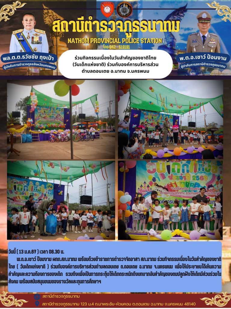 พ.ต.อ.เชาว์ ป้อมงาม ผกก.สภ.นาทม พร้อมด้วยข้าราชการตำรวจจิตอาสา สภ.นาทม ร่วมกิจกรรมเนื่องในวันสำคัญของชาติไทย ( วันเด็กแห่งชาติ ) ร่วมกับองค์การบริหารส่วนตำบลดอนเตย ต.ดอนเตย อ.นาทม จ.นครพนม เพื่อให้ประชาชนได้เห็นความสำคัญและความต้องการของเด็ก รวมถึงเพื่อเป็นการกระตุ้นให้เด็กตระหนักถึงบทบาทอันสำคัญของตนปลูกฝังให้เด็กมีส่วนร่วมในสังคม พร้อมสนับสนุนขนมของรางวัลและทุนการศึกษาฯ