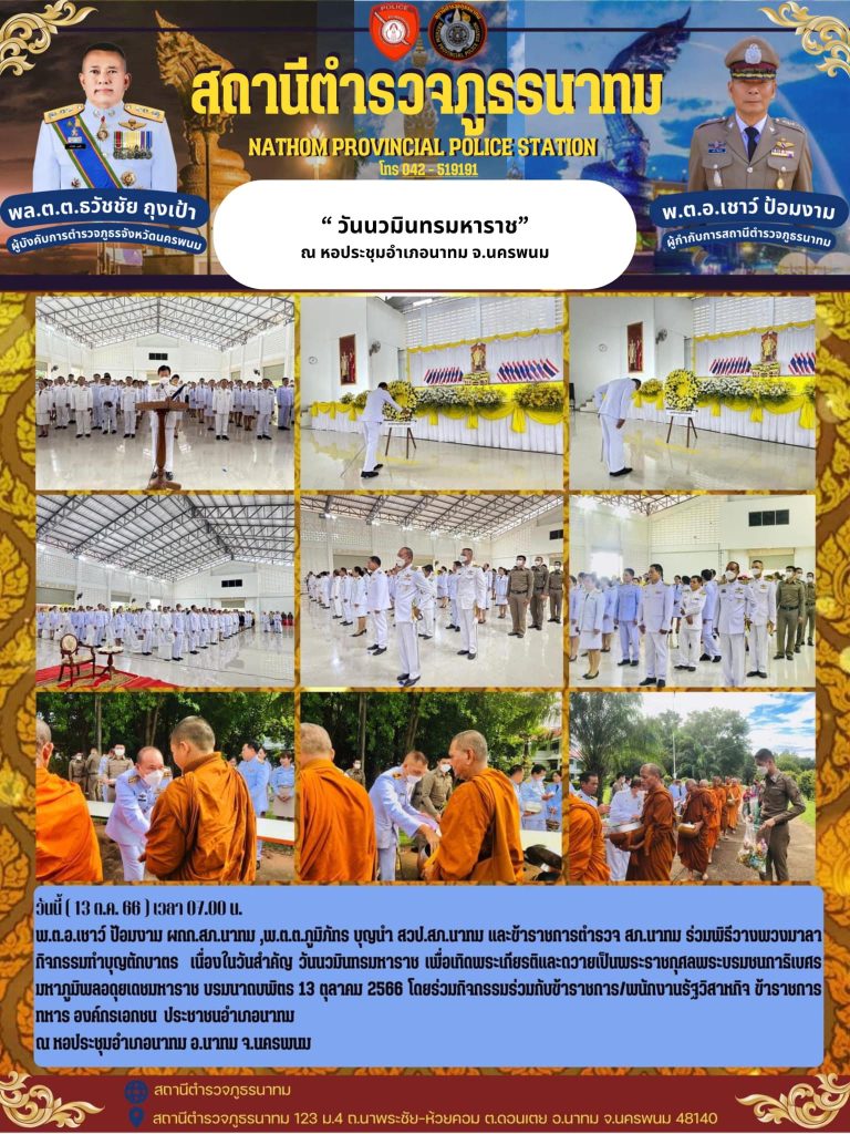 พ.ต.อ.เชาว์ ป้อมงาม ผกก.สภ.นาทม พ.ต.ต.ภูมิภัทร บุญนำ สวป.สภ.นาทม พร้อมด้วยข้าราชการตำรวจ สภ.นาทม ร่วมพิธีวางพวงมาลา กิจกรรมทำบุญตักบาตร เนื่องในวันสำคัญ วันนวมินทรมหาราช เพื่อเทิดพระเกียรติและถวายเป็นพระราชกุศลพระบรมชนกาธิเบศร มหาภูมิพลอดุยเดชมหาราช บรมนาถบพิตร 13 ตุลาคม 2566 โดยร่วมกิจกรรมร่วมกับข้าราชการ/พนักงานรัฐวิสาหกิจ ข้าราชการทหาร องค์กรเอกชน ประชาชนอำเภอนาทม ณ หอประชุมอำเภอนาทม อ.นาทม จ.นครพนม