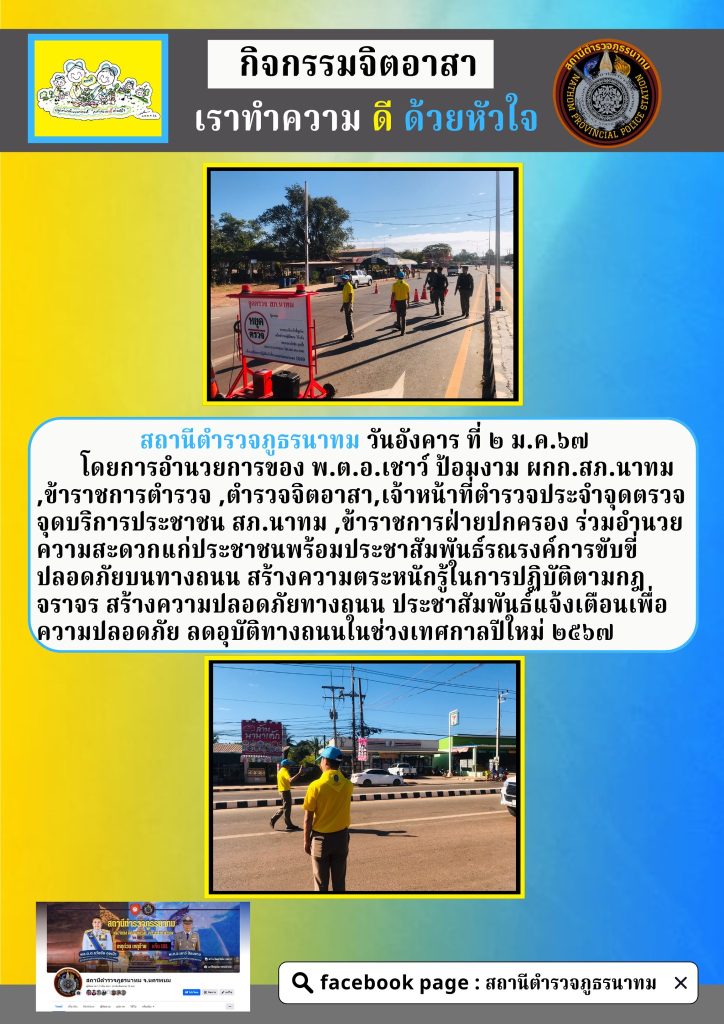 โดยการอำนวยการของ พ.ต.อ.เชาว์ ป้อมงาม ผกก.สภ.นาทม มอบหมายให้ ข้าราชการตำรวจ ,ตำรวจจิตอาสา,เจ้าหน้าที่ตำรวจประจำจุดตรวจจุดบริการประชาชน สภ.นาทม ,ข้าราชการฝ่ายปกครอง ร่วมอำนวยความสะดวกแก่ประชาชนพร้อมประชาสัมพันธ์รณรงค์การขับขี่ปลอดภัยบนทางถนน สร้างความตระหนักรู้ในการปฏิบัติตามกฎจราจร สร้างความปลอดภัยทางถนน ประชาสัมพันธ์แจ้งเตือนเพื่อความปลอดภัย ลดอุบัติทางถนนในช่วงเทศกาลปีใหม่ ๒๕๖๗