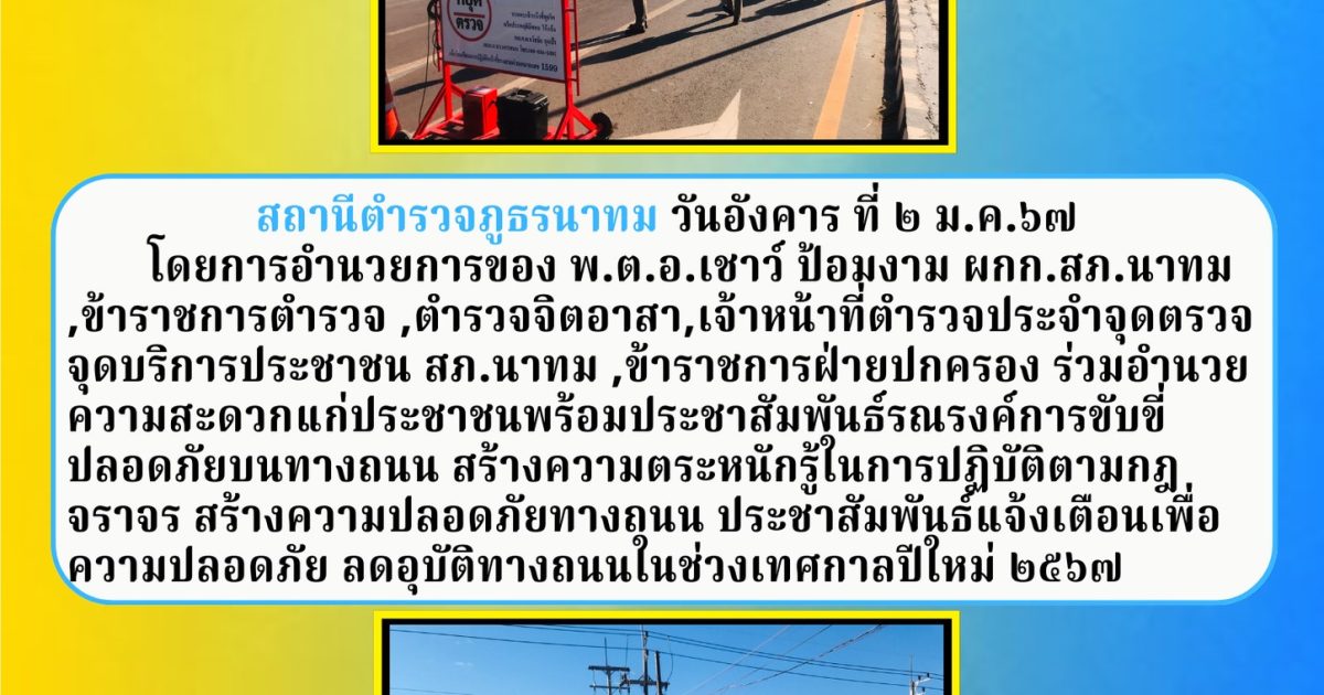 โดยการอำนวยการของ พ.ต.อ.เชาว์ ป้อมงาม ผกก.สภ.นาทม มอบหมายให้ ข้าราชการตำรวจ ,ตำรวจจิตอาสา,เจ้าหน้าที่ตำรวจประจำจุดตรวจจุดบริการประชาชน สภ.นาทม ,ข้าราชการฝ่ายปกครอง ร่วมอำนวยความสะดวกแก่ประชาชนพร้อมประชาสัมพันธ์รณรงค์การขับขี่ปลอดภัยบนทางถนน สร้างความตระหนักรู้ในการปฏิบัติตามกฎจราจร สร้างความปลอดภัยทางถนน ประชาสัมพันธ์แจ้งเตือนเพื่อความปลอดภัย ลดอุบัติทางถนนในช่วงเทศกาลปีใหม่ ๒๕๖๗