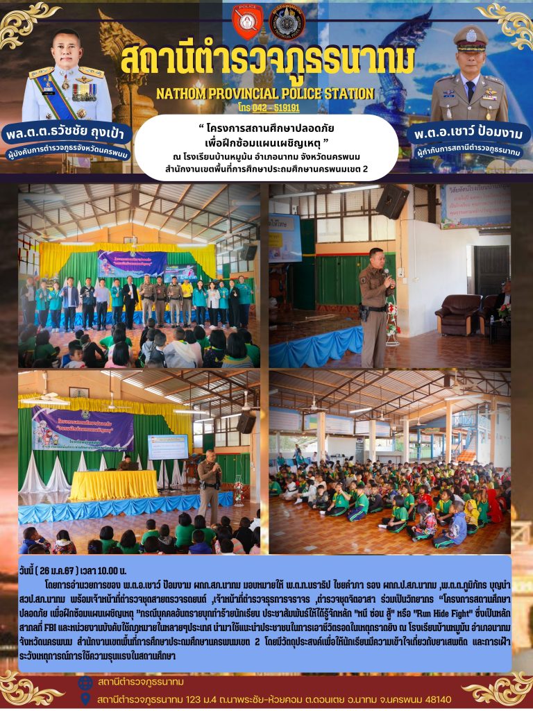 โดยการอำนวยการของ พ.ต.อ.เชาว์ป้อมงาม ผกก.สภ.นาทม มอบหมายให้ พ.ต.ท.นราธิป ไชยคำภา รอง ผกก.ป.สภ.นาทม ,พ.ต.ต.ภูมิภัทร บุญนำ สวป.สภ.นาทม พร้อมเจ้าหน้าที่ตำรวจชุดสายตรวจรถยนต์ ,เจ้าหน้าที่ตำรวจธุรการจราจร ,ตำรวจชุดจิตอาสา ร่วมเป็นวิทยากร “โครงการสถานศึกษาปลอดภัย เพื่อฝึกซ้อมแผนเผชิญเหตุ ”กรณีบุคคลอันตรายบุกทำร้ายนักเรียน ประชาสัมพันธ์ให้ได้รู้จักหลัก “หนี ซ่อน สู้” หรือ “Run Hide Fight” ซึ่งเป็นหลักสากลที่ FBI และหน่วยงานบังคับใช้กฎหมายในหลายๆประเทศ นำมาใช้แนะนำประชาชนในการเอาชีวิตรอดในเหตุกราดยิง ณ โรงเรียนบ้านหมูม้น อำเภอนาทม จังหวัดนครพนม สำนักงานเขตพื้นที่การศึกษาประถมศึกษานครพนมเขต 2 โดยมีวัตถุประสงค์เพื่อให้นักเรียนมีความเข้าใจเกี่ยวกับยาเสพติด และการเฝ้าระวังเหตุการณ์การใช้ความรุนแรงในสถานศึกษา