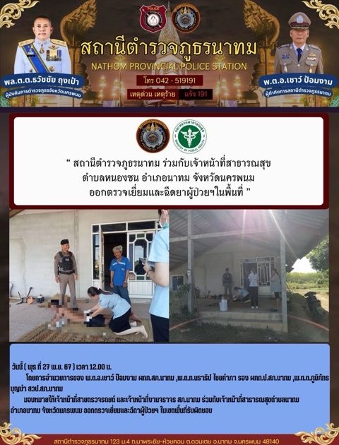 สภ.นาทม ร่วมกับเจ้าหน้าที่สาธารณสุขตำบลนาทมอำเภอนาทม จังหวัดนครพนม ออกตรวจเยี่ยมและฉีดาผู้ป่วยฯ ในเขตพื้นที่รับผิดชอบ
