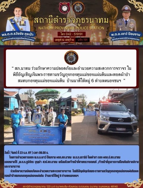 ร่วมรักษาความปลอดภัยและอำนวยความสะดวกการจราจร ในพิธีอัญเชิญเงินพระราชทานขวัญถุงกองทุนแม่ของแผ่นดินและทอดผ้าป่าสมทบกองทุนแม่ของแผ่นดิน บ้านนาดีใต้ หมู่ 6 ต.หนองซน อ.นาทม จ.นครพนม