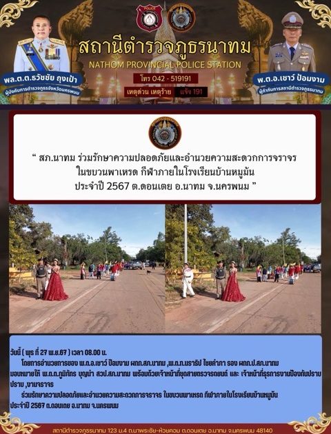 สภ.นาทม ร่วมรักษาความปลอดภัยและอำนวยความสะดวกการจราจร ในขบวนพาเหรด กีฬาภายในโรงเรียนบ้านหมูม้น ประจำปี 2567 ต.ดอนเตย อ.นาทม จ.นครพนม