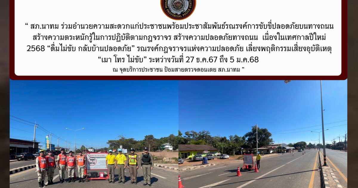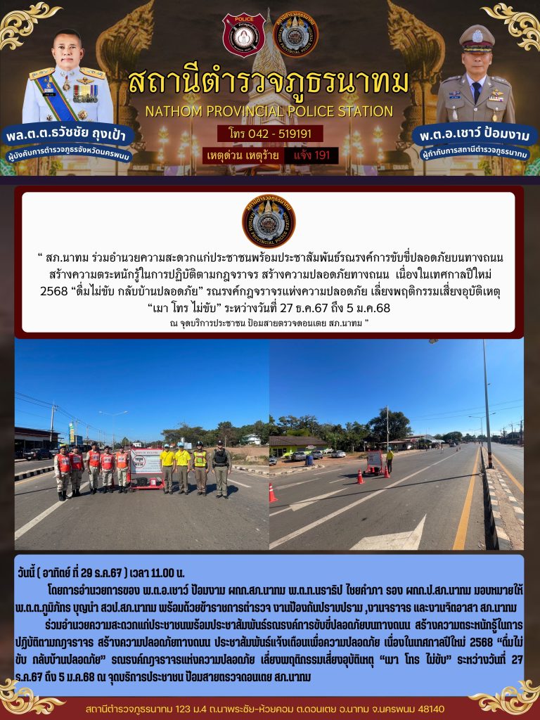 ร่วมอำนวยความสะดวกแก่ประชาชนพร้อมประชาสัมพันธ์รณรงค์การขับขี่ปลอดภัยบนทางถนน สร้างความตระหนักรู้ในการปฏิบัติตามกฎจราจร สร้างความปลอดภัยทางถนน ประชาสัมพันธ์แจ้งเตือนเพื่อความปลอดภัย เนื่องในเทศกาลปีใหม่ 2568 “ดื่มไม่ขับ กลับบ้านปลอดภัย” รณรงค์กฎจราจรแห่งความปลอดภัย เลี่ยงพฤติกรรมเสี่ยงอุบัติเหตุ “เมา โทร ไม่ขับ” ระหว่างวันที่ 27 ธ.ค.67 ถึง 5 ม.ค.68 ณ จุดบริการประชาชน ป้อมสายตรวจดอนเตย สภ.นาทม