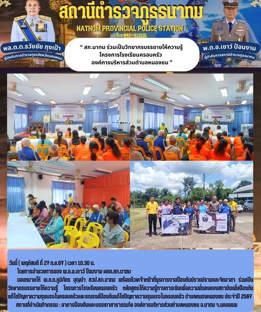 มอบหมายให้ พ.ต.ต.ภูมิภัทร บุญนำ สวป.สภ.นาทม พร้อมด้วยเจ้าหน้าที่ธุรการงานป้องกันปราบปรามและจิตอาสา ร่วมเป็นวิทยากรบรรยายให้ความรู้ โครงการโรงเรียนครอบครัว หลักสูตรให้ความรู้ทางการเงินเพื่อความมั่นคงของสถาบันเพื่อป้องกัน แก้ไขปัญหาความรุนแรงในครอบครัวและรณรงค์ป้องกันแก้ไขปัญหาความรุนแรงในครอบครัว ตำบลหนองหนองซน ประจำปี 2567