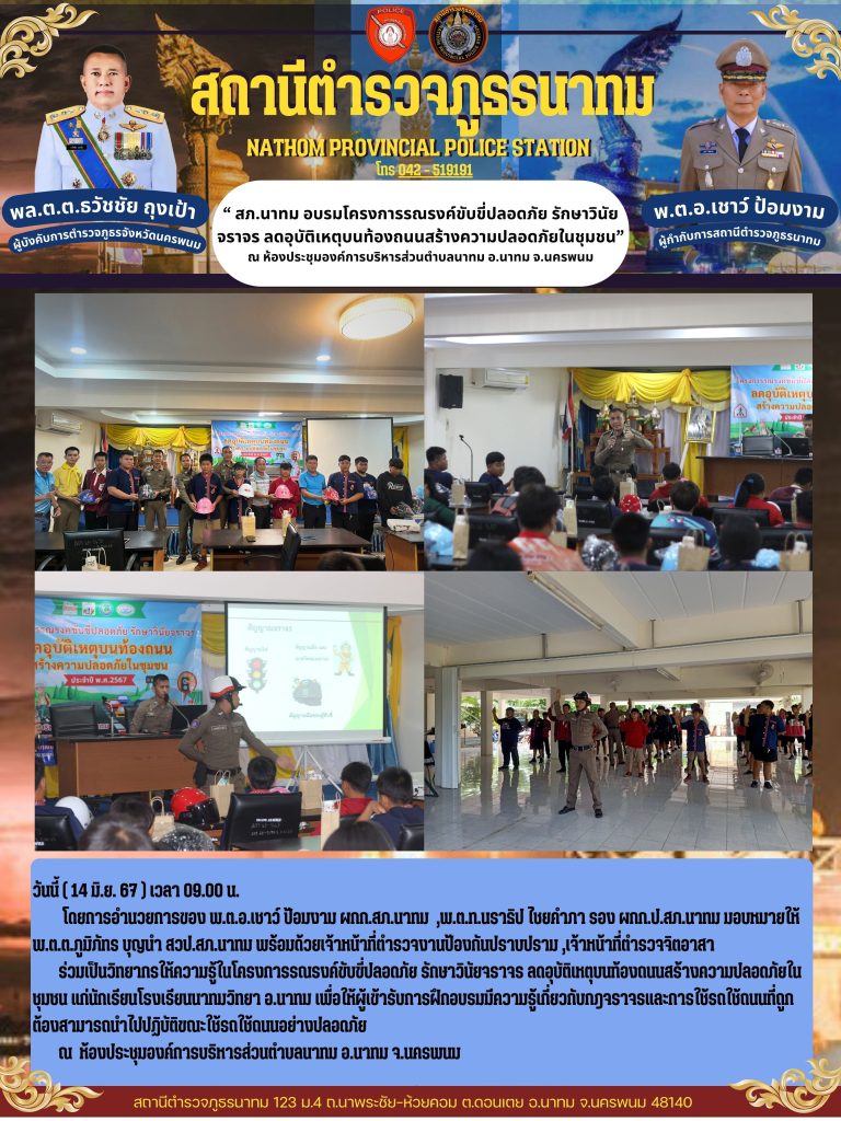 ร่วมเป็นวิทยากรให้ความรู้ในโครงการรณรงค์ขับขี่ปลอดภัย รักษาวินัยจราจร ลดอุบัติเหตุบนท้องถนนสร้างความปลอดภัยในชุมชน แก่นักเรียนโรงเรียนนาทมวิทยา อ.นาทม เพื่อให้ผู้เข้ารับการฝึกอบรมมีความรู้เกี่ยวกับกฎจราจรและการใช้รถใช้ถนนที่ถูกต้องสามารถนำไปปฏิบัติขณะใช้รถใช้ถนนอย่างปลอดภัย