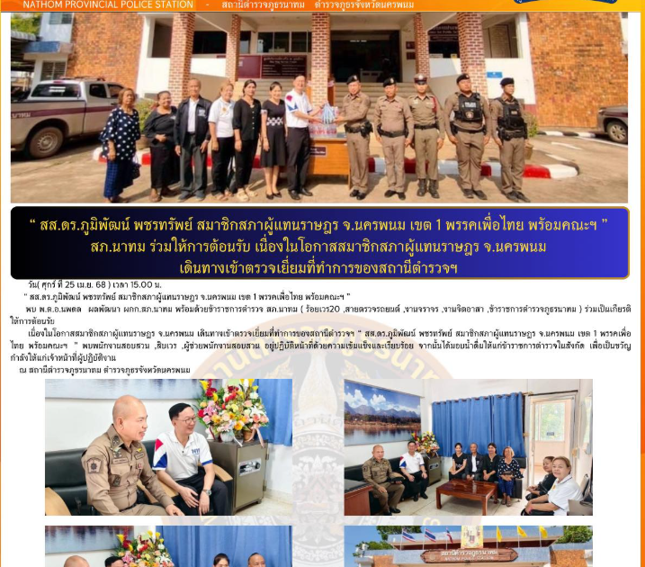 “ สส.ดร.ภูมิพัฒน์ พชรทรัพย์ สมาชิกสภาผู้แทนราษฎร จ.นครพนม เขต 1 พรรคเพื่อไทย พร้อมคณะฯ ”พบ พ.ต.อ.นพดล ผลพัฒนา ผกก.สภ.นาทม พร้อมด้วยข้าราชการตำรวจ สภ.นาทม ( ร้อยเวร20 ,สายตรวจรถยนต์ ,งานจราจร ,งานจิตอาสา ,ข้าราชการตำรวจภูธรนาทม ) ร่วมเป็นเกียรติให้การต้อนรับ
