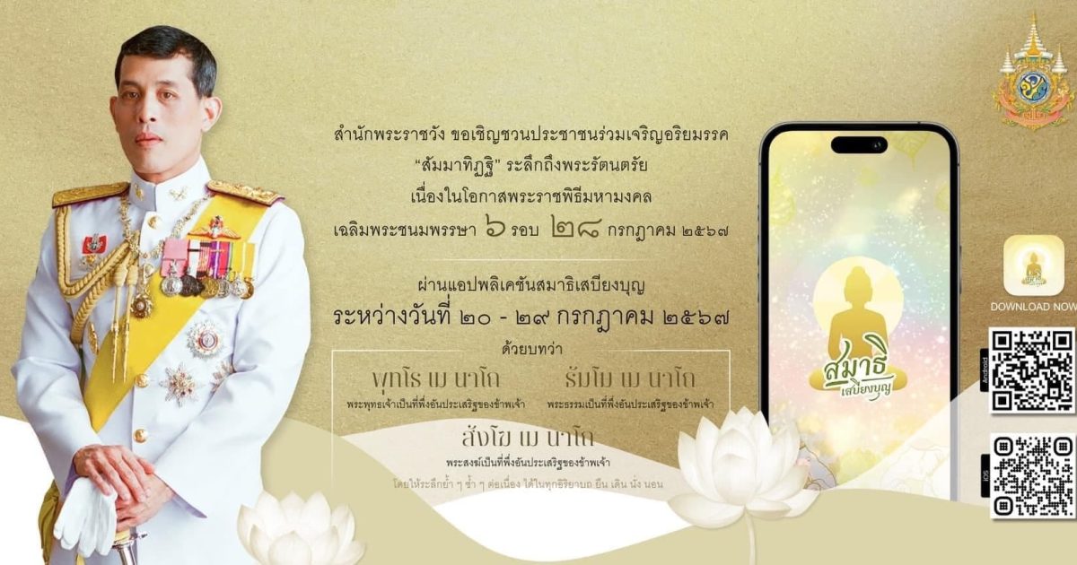ผ่านแอปพลิเคชัน “สมาธิเสบียงบุญ” ระหว่างวันที่ ๒๐ กรกฏาคม ๒๕๖๗ เวลา ๐๘.๐๐ น. ถึง วันที่ ๒๙ กรกฏาคม ๒๕๖๗ เวลา ๐๘.๐๐ น.
