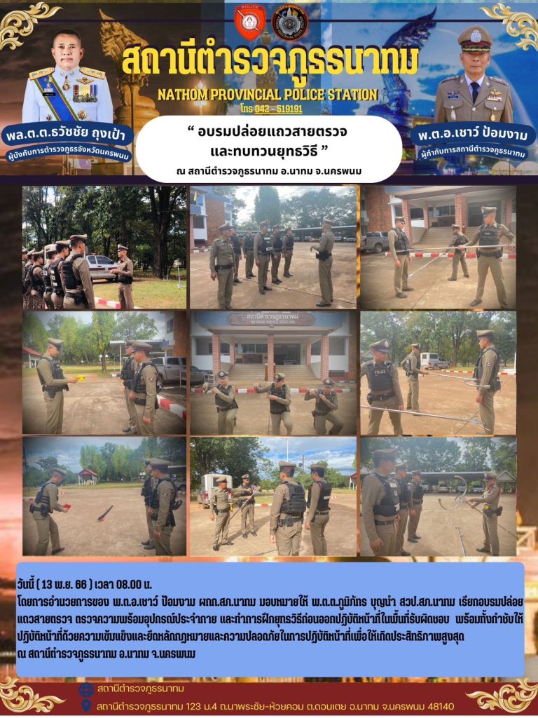 โดยการอำนวยการของ พ.ต.อ.เชาว์ ป้อมงาม ผกก.สภ.นาทม มอบหมายให้ พ.ต.ต.ภูมิภัทร บุญนำ สวป.สภ.นาทม เรียกอบรมปล่อยแถวสายตรวจ ตรวจความพร้อมอุปกรณ์ประจำกาย และทำการฝึกยุทธวิธีก่อนออกปฏิบัติหน้าที่ในพื้นที่รับผิดชอบ พร้อมทั้งกำชับให้ปฏิบัติหน้าที่ด้วยความเข้มแข็งและยึดหลักกฏหมายและความปลอดภัยในการปฏิบัติหน้าที่เพื่อให้เกิดประสิทธิภาพสูงสุด ณ สถานีตำรวจภูธรนาทม อ.นาทม จ.นครพนม