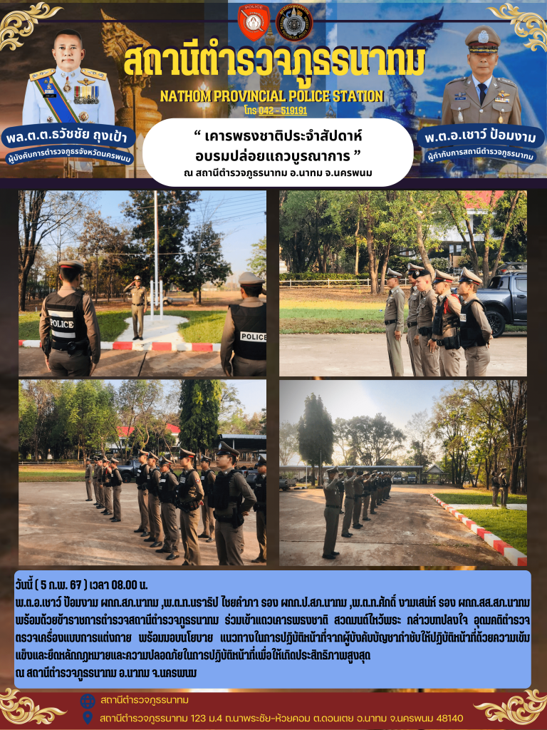 พ.ต.อ.เชาว์ ป้อมงาม ผกก.สภ.นาทม ,พ.ต.ท.นราธิป ไชยคำภา รอง ผกก.ป.สภ.นาทม ,พ.ต.ท.ศักดิ์ งามเสน่ห์ รอง ผกก.สส.สภ.นาทม พร้อมด้วยข้าราชการตำรวจสถานีตำรวจภูธรนาทม ร่วมเข้าแถวเคารพธงชาติ สวดมนต์ไหว้พระ กล่าวบทปลงใจ อุดมคติตำรวจ ตรวจเครื่องแบบการแต่งกาย พร้อมมอบนโยบาย แนวทางในการปฏิบัติหน้าที่จากผู้บังคับบัญชากำชับให้ปฏิบัติหน้าที่ด้วยความเข้มแข็งและยึดหลักกฏหมายและความปลอดภัยในการปฏิบัติหน้าที่เพื่อให้เกิดประสิทธิภาพสูงสุด