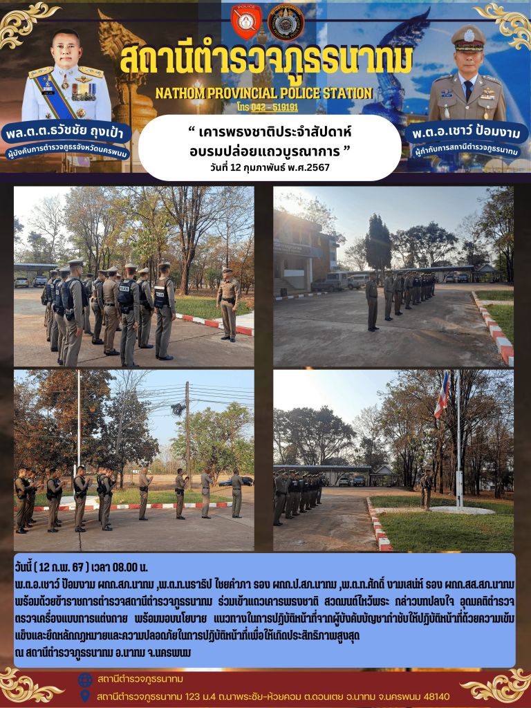 พ.ต.อ.เชาว์ ป้อมงาม ผกก.สภ.นาทม ,พ.ต.ท.นราธิป ไชยคำภา รอง ผกก.ป.สภ.นาทม ,พ.ต.ท.ศักดิ์ งามเสน่ห์ รอง ผกก.สส.สภ.นาทม พร้อมด้วยข้าราชการตำรวจสถานีตำรวจภูธรนาทม ร่วมเข้าแถวเคารพธงชาติ สวดมนต์ไหว้พระ กล่าวบทปลงใจ อุดมคติตำรวจ ตรวจเครื่องแบบการแต่งกาย พร้อมมอบนโยบาย แนวทางในการปฏิบัติหน้าที่จากผู้บังคับบัญชากำชับให้ปฏิบัติหน้าที่ด้วยความเข้มแข็งและยึดหลักกฏหมายและความปลอดภัยในการปฏิบัติหน้าที่เพื่อให้เกิดประสิทธิภาพสูงสุด