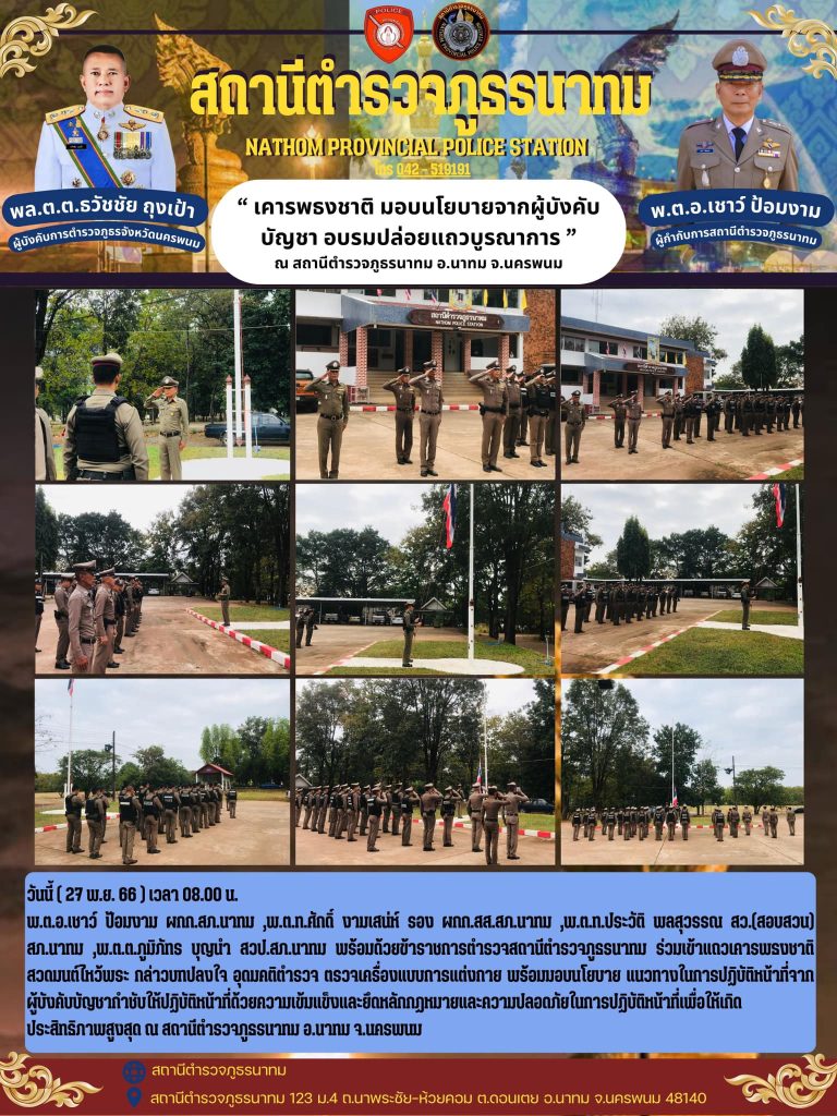 พ.ต.อ.เชาว์ ป้อมงาม ผกก.สภ.นาทม ,พ.ต.ท.ศักดิ์ งามเสน่ห์ รองผกก.สส.สภ.นาทม ,พ.ต.ท.ประวัติ พลสุวรรณ สว.(สอบสวน) สภ.นาทม ,พ.ต.ต.ภูมิภัทร บุญนำ สวป.สภ.นาทมพร้อมด้วยข้าราชการตำรวจสถานีตำรวจภูธรนาทม ร่วมเข้าแถวเคารพธงชาติ สวดมนต์ไหว้พระ กล่าวบทปลงใจ อุดมคติตำรวจ ตรวจเครื่องแบบการแต่งกาย พร้อมมอบนโยบาย แนวทางในการปฏิบัติหน้าที่จากผู้บังคับบัญชากำชับให้ปฏิบัติหน้าที่ด้วยความเข้มแข็งและยึดหลักกฏหมายและความปลอดภัยในการปฏิบัติหน้าที่เพื่อให้เกิดประสิทธิภาพสูงสุด ณ สถานีตำรวจภูธรนาทม อ.นาทม จ.นครพนม