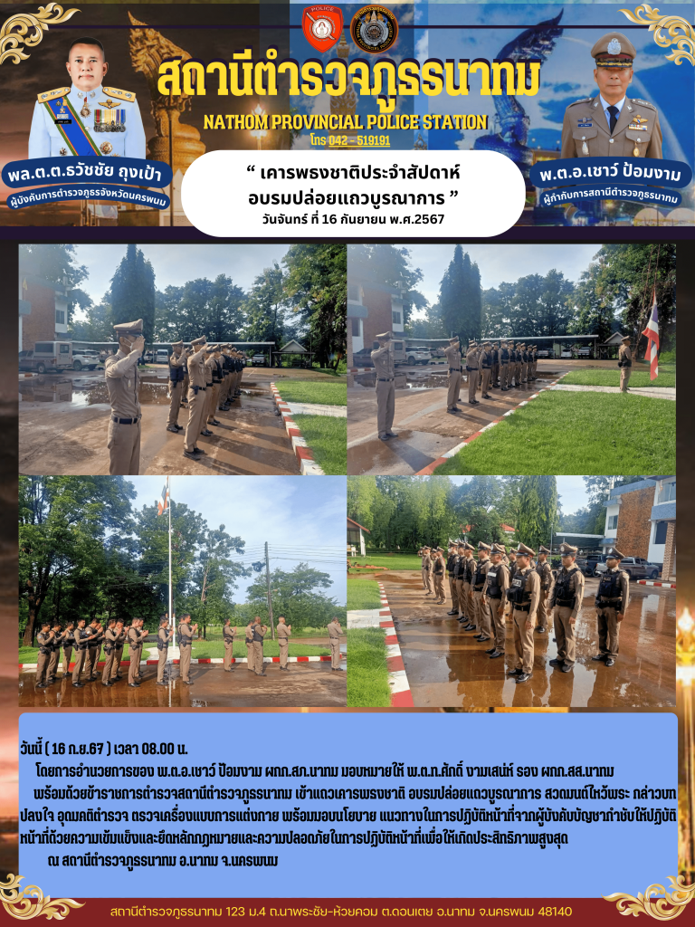 มอบหมายให้ พ.ต.ท.ศักดิ์ งามเสน่ห์ รอง ผกก.สส.สภ.นาทม พร้อมด้วยข้าราชการตำรวจสถานีตำรวจภูธรนาทม เข้าแถวเคารพธงชาติ อบรมปล่อยแถวบูรณาการ สวดมนต์ไหว้พระ กล่าวบทปลงใจ อุดมคติตำรวจ ตรวจเครื่องแบบการแต่งกาย พร้อมมอบนโยบาย แนวทางในการปฏิบัติหน้าที่จากผู้บังคับบัญชากำชับให้ปฏิบัติหน้าที่ด้วยความเข้มแข็งและยึดหลักกฏหมายและความปลอดภัยในการปฏิบัติหน้าที่เพื่อให้เกิดประสิทธิภาพสูงสุด