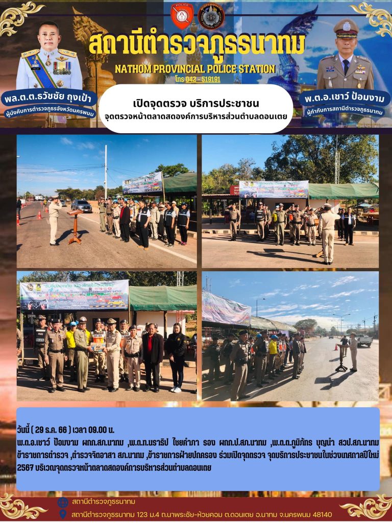 พ.ต.อ.เชาว์ ป้อมงาม ผกก.สภ.นาทม,พ.ต.ท.นราธิป ไชยคำภา รอง ผกก.ป.สภ.นาทม,พ.ต.ต.ภูมิภัทร บุญนำ สวป.สภ.นาทม ข้าราชการตำรวจ ,ตำรวจจิตอาสา สภ.นาทม ,ข้าราชการฝ่ายปกครอง ร่วมเปิดจุดตรวจ จุดบริการประชาชนในช่วงเทศกาลปีใหม่ 2567 บริเวณจุดตรวจหน้าตลาดสดองค์การบริหารส่วนตำบลดอนเตย