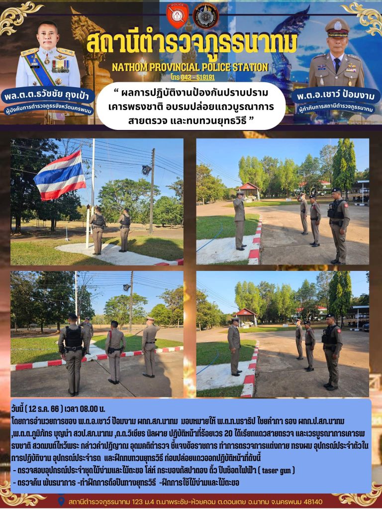 โดยการอำนวยการของ พ.ต.อ.เชาว์ ป้อมงาม ผกก.สภ.นาทม มอบหมายให้ พ.ต.ท.นราธิป ไชยคำกา รอง ผกก.ป.สภ.นาทม ,พ.ต.ต.ภูมิภัทร บุญนำ สวป.สภ.นาทม ,ด.ต.วิเชียร นิลผาย ปฏิบัติหน้าที่ร้อยเวร 20 ได้เรียกแถวสายตรวจ และเวรบูรณาการเคารพธงชาติ สวดมนต์ไหว้พระ กล่าวคำปฏิญาณ อุดมคติตำรวจ ชี้แจงข้อราชการ ทำการตรวจการแต่งกาย ทรงผม อุปกรณ์ประจำตัวในการปฏิบัติงาน อุปกรณ์ประจำรถ และฝึกทบทวนยุทธวิธี ก่อนปล่อยแถวออกปฏิบัติหน้าที่ดังนี้
