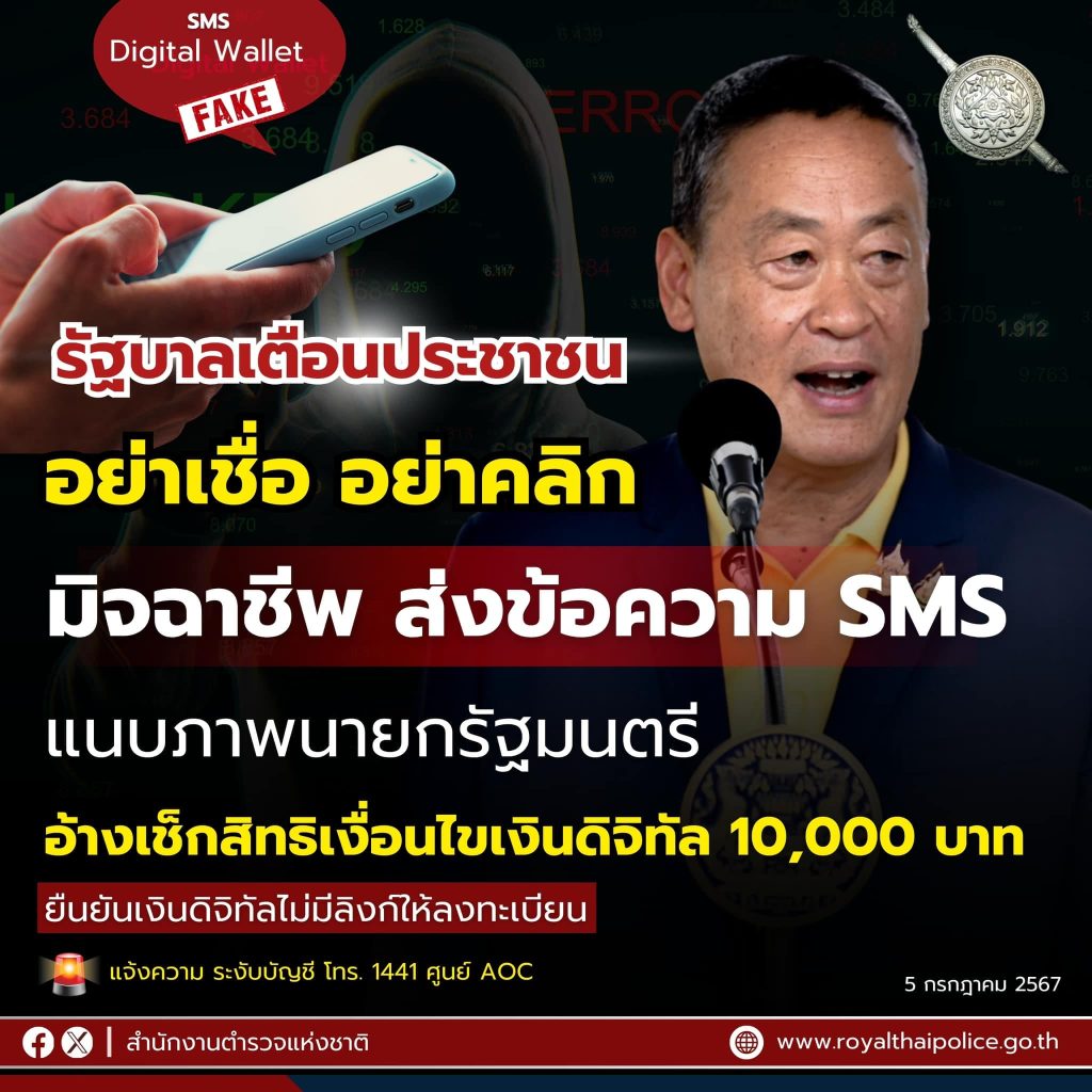 เมื่อวันที่ 5 กรกฎาคม 2567 นายชัย วัชรงค์ โฆษกประจำสำนักนายกรัฐมนตรี ย้ำเตือนประชาชนอย่าหลงมิจฉาชีพแอบอ้างส่งรูปนายเศรษฐา ทวีสิน นายกรัฐมนตรี พร้อมข้อความเช็คสิทธิเงื่อนไขเงินดิจิทัล 10,000 บาท ส่งไปทาง SMS หากประชาชนได้รับข้อความดังกล่าวพร้อมรูปนายกรัฐมนตรี อย่ากดลิงก์เข้าไปดูโดยเด็ดขาด หากกดเข้าไประบบจะถูกล็อก มิจฉาชีพจะดูดเงินในบัญชีธนาคาร ทำให้สูญเสียเงินทั้งบัญชี