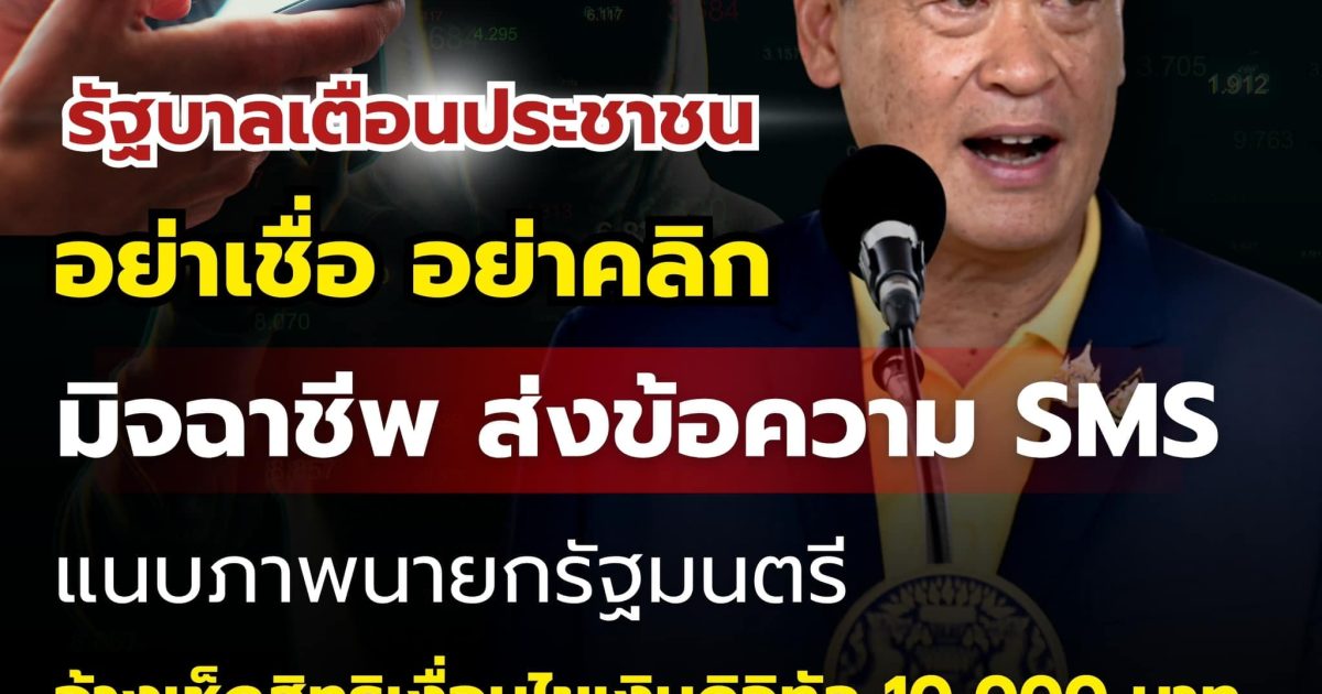 รัฐบาลเตือนประชาชน อย่าหลงเชื่อมิจฉาชีพ แอบอ้างส่งข้อความเช็กสิทธิเงื่อนไขเงินดิจิทัล 10,000 บาท พร้อมแนบรูปนายกฯ ส่งผ่าน SMS ย้ำอย่ากดลิงก์เข้าไปดูอย่างเด็ดขาด