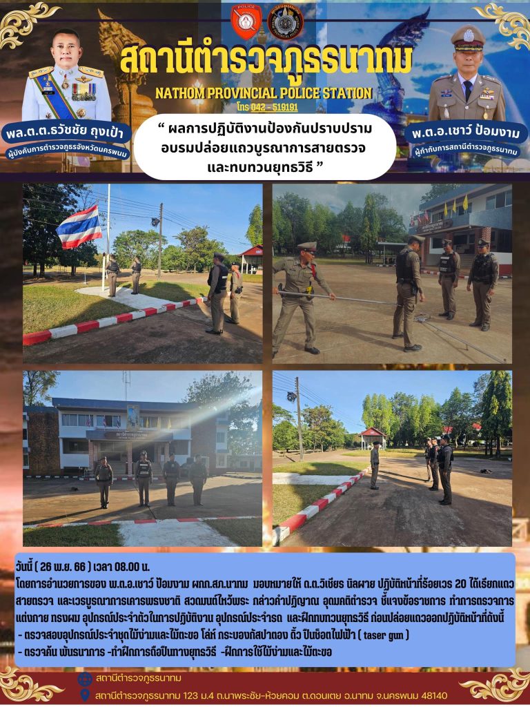 โดยการอำนวยการของ พ.ต.อ.เชาว์ ป้อมงาม ผกก.สภ.นาทม มอบหมายให้ ด.ต.วิเชียร นิลผาย ปฏิบัติหน้าที่ร้อยเวร 20 ได้เรียกแถวสายตรวจ และเวรบูรณาการเคารพธงชาติ สวดมนต์ไหว้พระ กล่าวคำปฏิญาณ อุดมคติตำรวจ ชี้แจงข้อราชการ ทำการตรวจการแต่งกาย ทรงผม อุปกรณ์ประจำตัวในการปฏิบัติงาน อุปกรณ์ประจำรถ และฝึกทบทวนยุทธวิธี ก่อนปล่อยแถวออกปฏิบัติหน้าที่ดังนี้
