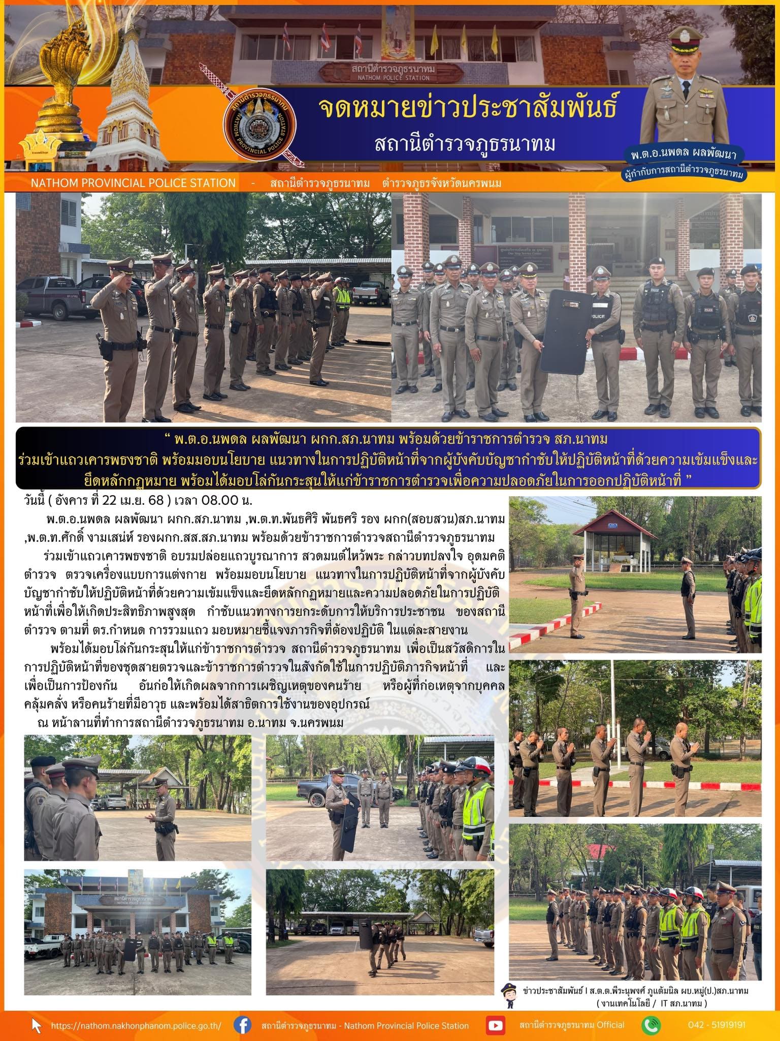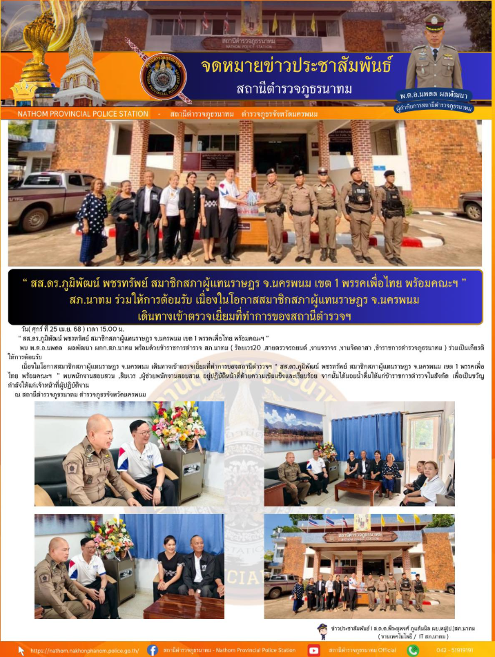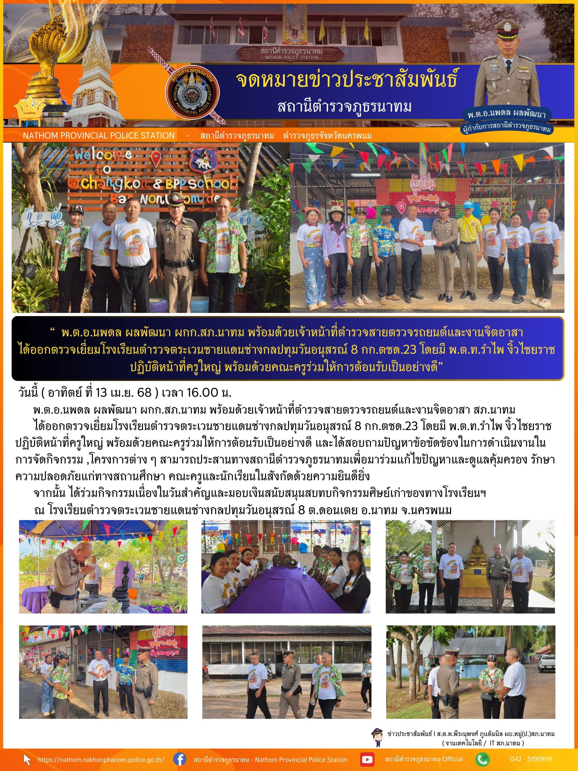 พ.ต.อ.นพดล ผลพัฒนา ผกก.สภ.นาทม พร้อมด้วยเจ้าหน้าที่ตำรวจสายตรวจรถยนต์และงานจิตอาสา สภ.นาทม ได้ออกตรวจเยี่ยมโรงเรียนตำรวจตระเวนชายแดนช่างกลปทุมวันอนุสรณ์ 8 กก.ตชด.23 โดยมี พ.ต.ท.รำไพ งิ้วไชยราช ปฏิบัติหน้าที่ครูใหญ่ พร้อมด้วยคณะครูร่วมให้การต้อนรับเป็นอย่างดี และได้สอบถามปัญหาข้อขัดข้องในการดำเนินงานในการจัดกิจกรรม ,โครงการต่าง ๆ สามารถประสานทางสถานีตำรวจภูธรนาทมเพื่อมาร่วมแก้ไขปัญหาและดูแลคุ้มครอง รักษาความปลอดภัยแก่ทางสถานศึกษา คณะครูและนักเรียนในสังกัดด้วยความยินดียิ่ง