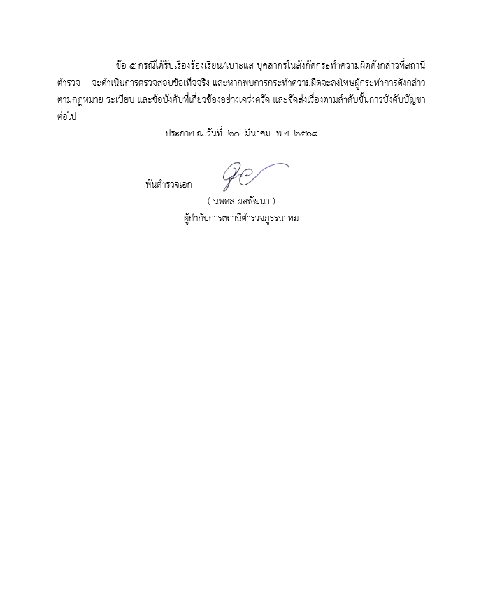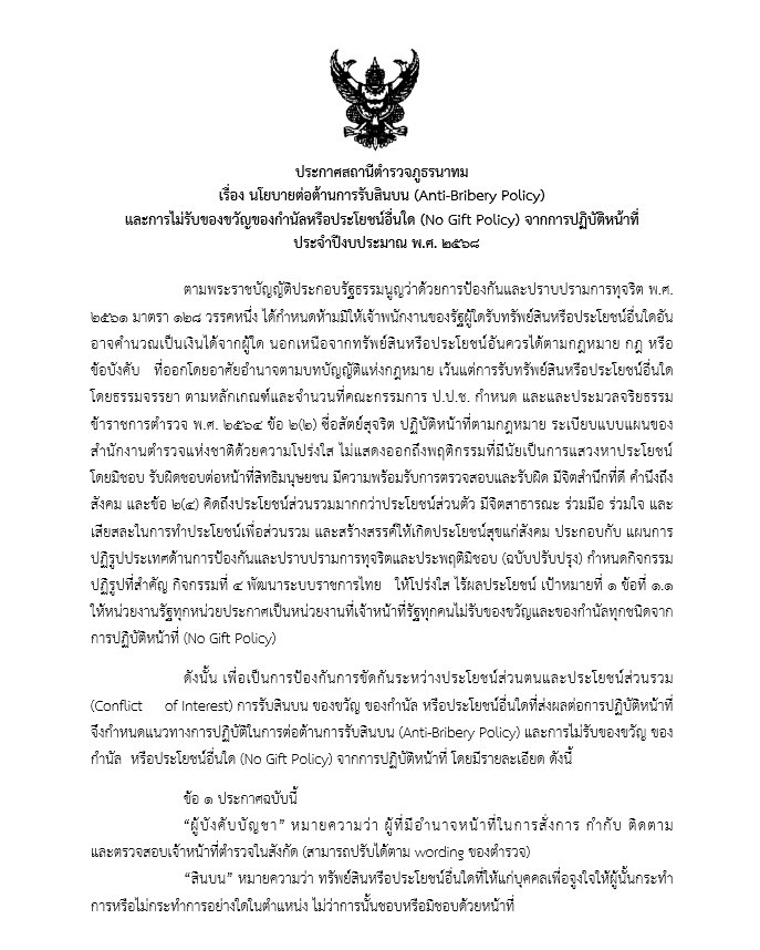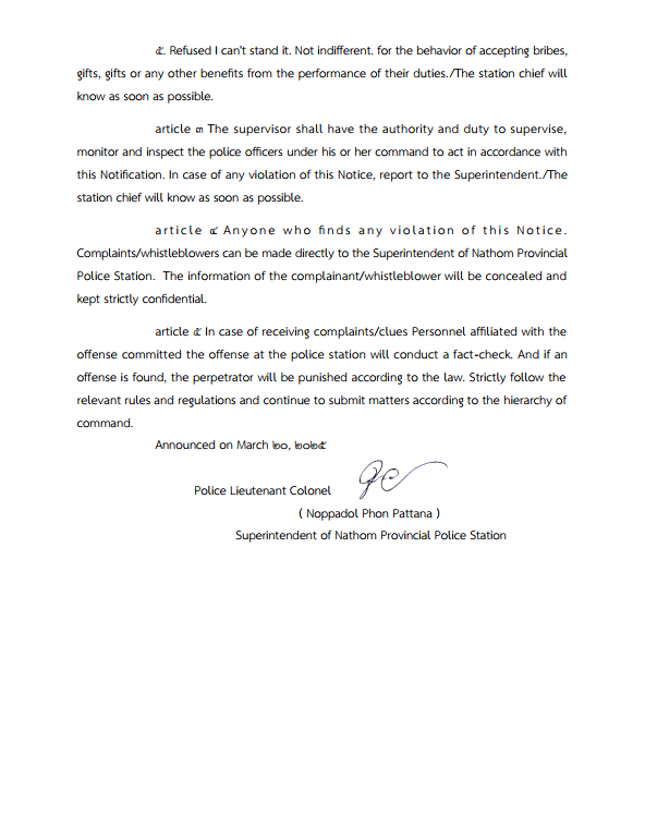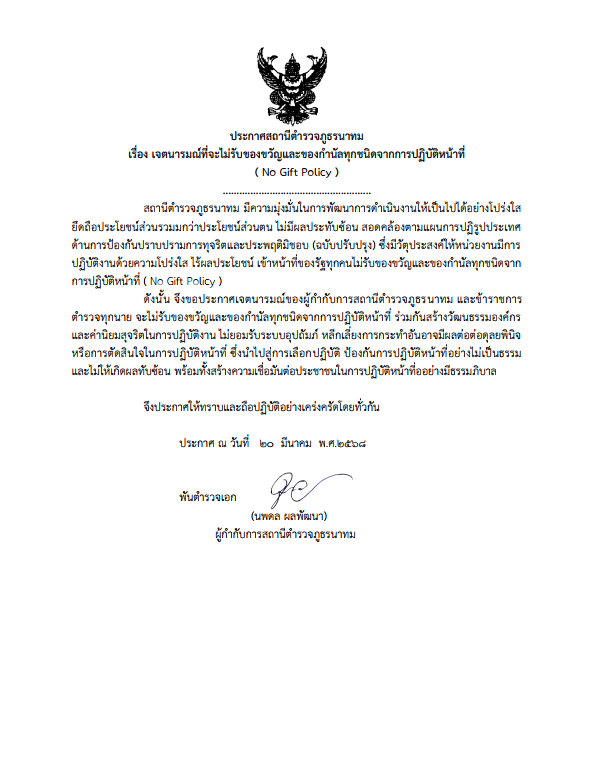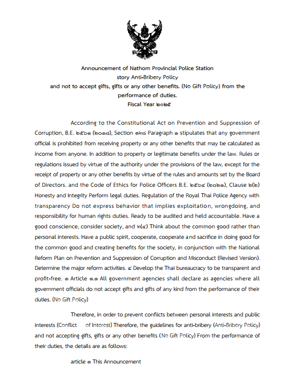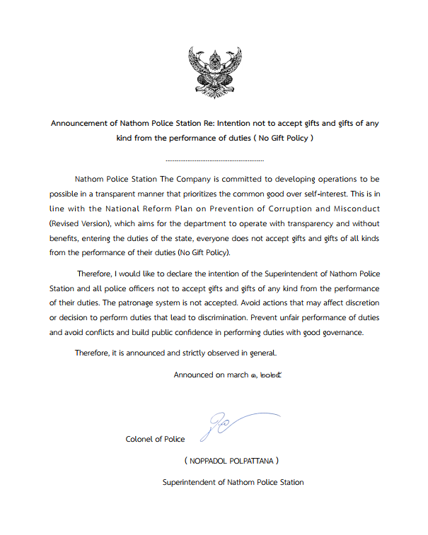 Announcement of Nathom Police Station Re: Intention not to accept gifts and gifts of any kind from the performance of duties ( No Gift Policy )