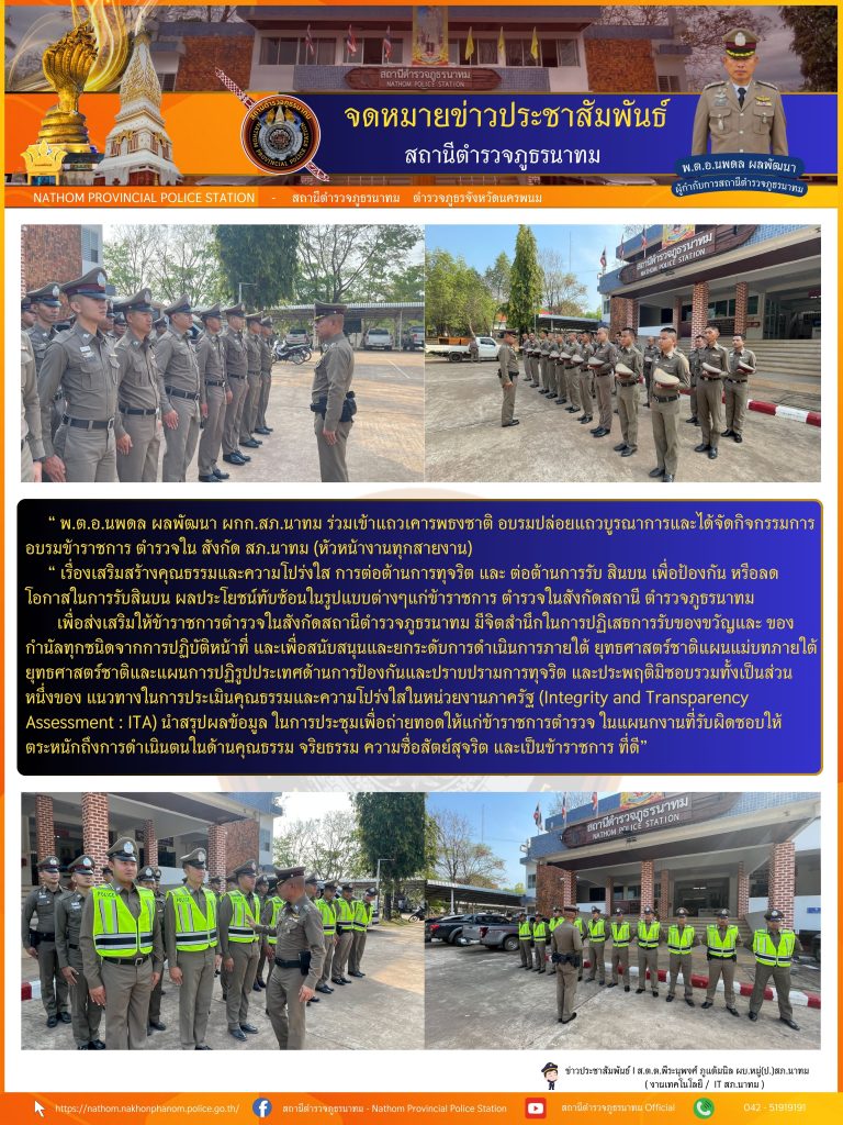 ได้จัดอบรมการส่งเสริมคุณธรรมจริยธรรมและจรรยาบรรณ กำชับการไม่รับสินบนในการปฏิบัติหน้าที่ให้แก่ข้าราชการตำรวจในสังกัดสถานีตำรวจภูธรนาทม ณ ห้องประชุมสถานีตำรวจภูธรนาทม