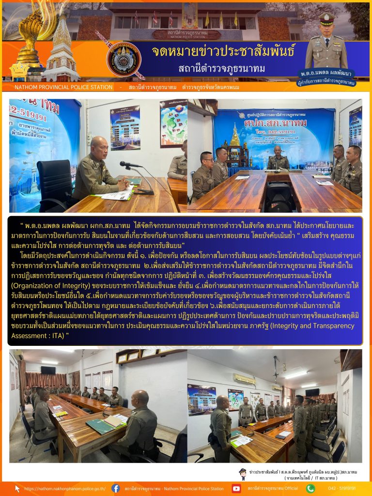 ได้จัดอบรมการส่งเสริมคุณธรรมจริยธรรมและจรรยาบรรณ เพื่อป้องกันการทุจริตภายในสถานีตำรวจภูธรนาทม ณ ห้องประชุมสถานีตำรวจภูธรนาทม