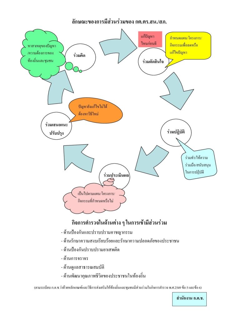 (2) คณะกรรมกรตรวจสอบและติดตามการบริหารงานตำรวจกรุงเทพมหานคร เรียกโดยย่อว่า กต.ตร.กทม. และคณะกรรมการตรวจสอบและติดตามการบริหารงานตำรวจจังหวัด เรียกโดยย่อว่า กต.ตร.จังหวัด ต่อมาคณะกรรมการตรวจสอบและติดตามการบริหารงานตำรวจแห่งชาติ ( กต.ตร. ) ได้ออกระเบียบ กต.ตร.ว่าด้วยหลักเกณฑ์และวิธีการแต่งตั้งคณะกรรมการระดับสถานีตำรวจ พ.ศ. 2543 กำหนดให้มีคณะกรรมการตรวจสอบและติดตามการบริหารงานระดับสถานีตำรวจในสังกัดกองบัญชาการตำรวจนครบาลและตำรวจภูธรภาค 1 ถึง9 เรียกโดยย่อว่า “กต.ตร.สถานีตำรวจ” และตามข้อ 10 ของระเบียบดังกล่าวได้ให้อำนาจสำนักงานตำรวจแห่งชาติกำหนดหลักเกณฑ์และวิธีการแต่งตั้งคณะกรรมการหน่วยงานอื่นในระดับเดียวกับสถานีตำรวจซึ่งมีหน้าที่รับผิดชอบเกี่ยวข้องกับการรักษาความปลอดภัยในชีวิตและทรัพย์สินของประชาชนและการให้บริการแก่ประชาชน ซึ่งได้แก่ ตำรวจทางหลวง ตำรวจท่องเที่ยวและตำรวจรถไฟ ในปี พ.ศ. 2547 ได้มีการตรา พ.ร.บ.ตำรวจแห่งชาติ พ.ศ. 2547 ขึ้นเพื่อเป็นกฎหมายบริหารราชการตำรวจ ตามกฎหมายนี้มีบทบัญญัติที่ให้ประชาชนมีส่วนร่วมในการบริหารงานตำรวจ ตามเจตนารมณ์ของรัฐธรรมนูญดังกล่าวข้างต้นไว้อย่างชัดเจน โดยกำหนดไว้ในมาตรา 7 ว่า ” ให้สำนักงานตำรวจแห่งชาติส่งสริมให้ท้องถิ่นและ ชุมชนมีส่วนร่วมในกิจการตำรวจเพื่อป้องกันและปราบปราม การกระทำความผิดทางอาญา รักษาความสงบเรียบร้อย และรักษาความปลอดภัยของประชาชนตามความเหมาะสม และความต้องการของแต่ละพื้นที่ ทั้งนี้การคำเนินการมีส่วนร่วมให้เป็นไปตามหลักเกณฑ์และวิธีการที่ ก.ต.ช. กำหนด “ พร้อมกันนี้ได้มีการเปลี่ยนแปลงระบบการบริหารงานตำรวจโดยกำหนดให้มีองค์กรนโยบายขึ้นใหม่แทนคณะกรรมการตรวจสอบและติดตามการบริหารงานดำรวจแห่งชาติ (กต.ตร.) เรียกว่าคณะกรรมการนโยบายตำรวจแห่งชาติ เรียกโดยย่อว่า ก.ต.ช. มีอำนาจหน้าที่ในการกำหนดนโยบายการบริหารราชการตำรวจ และกำกับดูแลสำนักงานตำรวจแห่งชาติให้ปฏิบัติตามน โยบาย ระเบียบแบบแผน มติคณะรัฐมนตรีและกฎหมาย นอกจากนี้ยังให้มีอำนาจหน้าที่ในการ 1) ออกระเบียบ ประกาศ หรือมีมติในเรื่องที่เกี่ยวกับการบริหารราชการตำรวจและวิธีปฏิบัติราชการของข้ราชการตำรวจให้เป็นไปตามแบบแผนและนโยบายที่ ก.ต.ช. กำหนด 2) เสนอแนะให้มีการตรา พ.ร.ฏ.โอนอำนาจหน้าที่ให้เป็นของหน่วยงานหรือพนักงานเจ้าหน้าที่อื่นใด ตามมาตรา 6 วรรคสอง 3) พิจารณาคำเนินการคัดเลือกข้าราชการตำรวจเพื่อดำเนินการแต่งตั้งผู้บัญชาการตำรวจแห่งชาติตามที่นายกรัฐมนตรีเสนอ 4) กำหนดกระบวนการและขั