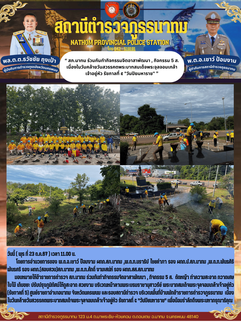 วันนี้ ( พุธ ที่ 23 ต.ค.67 ) เวลา 11.00 น. โดยการอำนวยการของ พ.ต.อ.เชาว์ ป้อมงาม ผกก.สภ.นาทม ,พ.ต.ท.นราธิป ไชยคำภา รอง ผกก.ป.สภ.นาทม ,พ.ต.ท.พันธศิริ พันธศริ รอง ผกก.(สอบสวน)สภ.นาทม ,พ.ต.ท.ศักดิ์ งามเสน่ห์ รอง ผกก.สส.สภ.นาทม มอบหมายให้ข้าราชการตำรวจ สภ.นาทม ,คณะกรรมการตรวจสอบและติดตามการบริหารงานตำรวจ (กต.ตร.) สภ.นาทม ร่วมกันทำกิจกรรมจิตอาสาพัฒนา , กิจกรรม 5 ส. ตัดหญ้า ทำความสะอาด กวาดเศษใบไม้ เก็บขยะ ปรับปรุงภูมิทัศน์ให้ดูสะอาด สวยงาม บริเวณหน้าลานพระบรมราชานุสาวรีย์ พระบาทสมเด็จพระจุลจอมเกล้าเจ้าอยู่หัว (รัชกาลที่ 5) ศูนย์ราชการอำเภอนาทม จังหวัดนครพนม และรอบสถานีตำรวจ บริเวณพื้นที่บ้านพักข้าราชการตำรวจภูธรนาทม เนื่องในวันคล้ายวันสวรรคตพระบาทสมเด็จพระจุลจอมเกล้าเจ้าอยู่หัว รัชกาลที่ ๕ “วันปิยมหาราช” เพื่อน้อมรำลึกถึงพระมหากรุณาธิคุณ