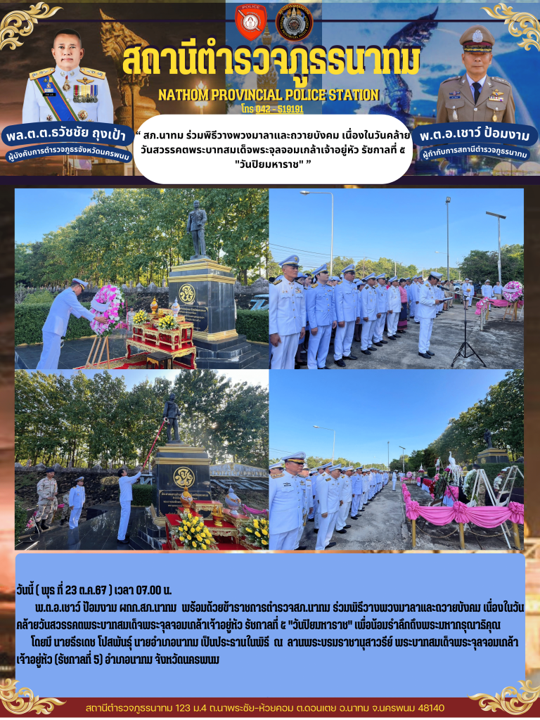 วันนี้ ( พุธ ที่ 23 ต.ค.67 ) เวลา 07.00 น. พ.ต.อ.เชาว์ ป้อมงาม ผกก.สภ.นาทม พร้อมด้วยข้าราชการตำรวจ สภ.นาทม ,คณะกรรมการตรวจสอบและติดตามการบริหารงานตำรวจ (กต.ตร.) สภ.นาทม ของสถานีตำรวจภูธรนาทม ร่วมพิธีวางพวงมาลาและถวายบังคม เนื่องในวันคล้ายวันสวรรคตพระบาทสมเด็จพระจุลจอมเกล้าเจ้าอยู่หัว รัชกาลที่ ๕ “วันปิยมหาราช” เพื่อน้อมรำลึกถึงพระมหากรุณาธิคุณ โดยมี นายธีรเดช โปสพันธุ์ นายอำเภอนาทม เป็นประธานในพิธี ณ ลานพระบรมราชานุสาวรีย์ พระบาทสมเด็จพระจุลจอมเกล้าเจ้าอยู่หัว (รัชกาลที่ 5) อำเภอนาทม จังหวัดนครพนม