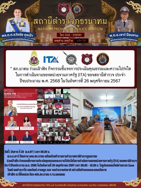 วันนี้ ( อังคาร ที่ 26 พ.ย.67 ) เวลา 09.00 น. พ.ต.อ.เชาว์ ป้อมงาม ผกก.สภ.นาทม พร้อมด้วยข้าราชการตำรวจสถานีตำรวจภูธรนาทม ,คณะกรรมการตรวจสอบและติดตามการบริหารงานตำรวจ (กต.ตร.) สภ.นาทม ร่วมเฝ้าฟัง กิจกรรมชี้แจงการประเมินคุณธรรมและความโปร่งใสในการดำเนินงานของหน่วยงานภาครัฐ (ITA) ของสถานีตำรวจ ประจำปีงบประมาณ พ.ศ. 2568 ในวันอังคารที่ 26 พฤศจิกายน 2567 เวลา 09.00 – 16.00 น. ในรูปแบบออนไลน์ผ่านระบบ Zoom โดยมี พลตำรวจโท ณพวัฒน์ อารยกูร รอง จเรตำรวจแห่งชาติ กล่าวเปิดกิจกรรมและมอบนโยบาย เฝ้าฟัง ณ ที่ตั้งหน่วย ห้อง ศปก.สภ.นาทม ภ.จว.นครพนม