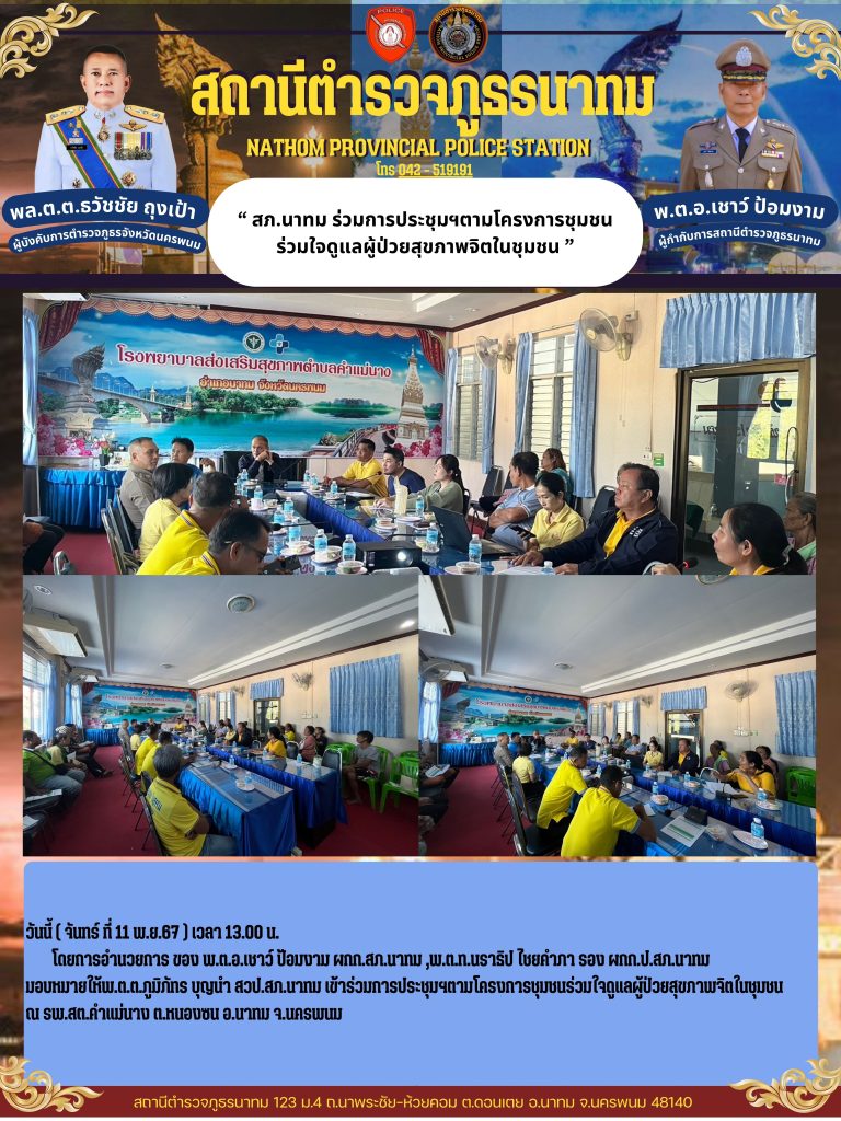 วันนี้ ( จันทร์ ที่ 11 พ.ย.67 ) เวลา 13.00 น. โดยการอำนวยการของ พ.ต.อ.เชาว์ ป้อมงาม ผกก.สภ.นาทม ,พ.ต.ท.นราธิป ไชยคำภา รอง ผกก.ป.สภ.นาทม มอบหมายให้ พ.ต.ต.ภูมิภัทร บุญนำ สวป.สภ.นาทม พร้อมด้วยเจ้าหน้าที่ชุดสายตรวจรถยนต์ และ เจ้าหน้าที่ธุรการงานป้องกันปราบปราบ ,งานจราจร ,คณะกรรมการตรวจสอบและติดตามการบริหารงานตำรวจ (กต.ตร.) สภ.นาทม ร่วมการประชุมฯตามโครงการชุมชนร่วมใจดูแลผู้ป่วยสุขภาพจิตในชุมชน ณ รพ.สต.คำแม่นาง ต.หนองซน อ.นาทม จ.นครพนม