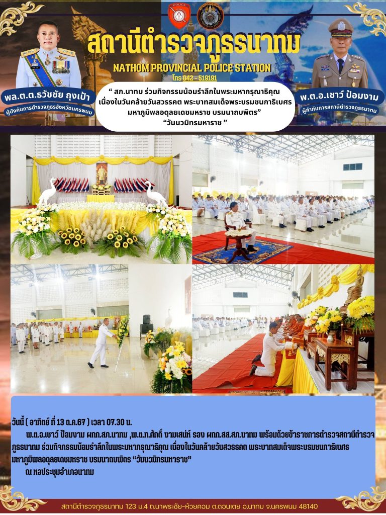 วันนี้ ( อาทิตย์ ที่ 13 ต.ค.67 ) เวลา 07.30 น. พ.ต.อ.เชาว์ ป้อมงาม ผกก.สภ.นาทม ,พ.ต.ท.ศักดิ์ งามเสน่ห์ รอง ผกก.สส.สภ.นาทม พร้อมด้วยข้าราชการตำรวจ สภ.นาทม ,คณะกรรมการตรวจสอบและติดตามการบริหารงานตำรวจ (กต.ตร.) ของสถานีตำรวจภูธรนาทม ร่วมกิจกรรมน้อมรำลึกในพระมหากรุณาธิคุณ เนื่องในวันคล้ายวันสวรรคต พระบาทสมเด็จพระบรมชนกาธิเบศร มหาภูมิพลอดุลยเดชมหราช บรมนาถบพิตร “วันนวมิทรมหาราช” ณ หอประชุมอำเภอนาทม